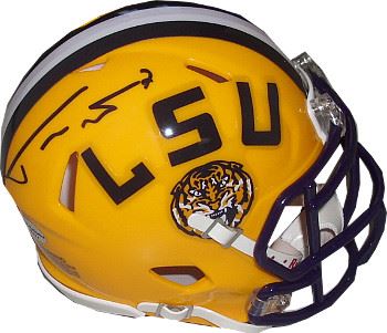 Tyrann "Honey Badger" Mathieu played college football for Louisiana State University (LSU). Following his 2011 college season during which he was recognized as a consensus All-American and a finalist for the Heisman Trophy, Mathieu was dismissed from the LSU Tigers football program. He was drafted by the Arizona Cardinals in the third round of the 2013 NFL Draft. Tyrann Mathieu has hand signed this LSU Tigers Riddell Speed Mini Helmet. Leaf Hologram and Certificate of Authenticity from Athlon Sports.