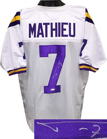 Tyrann "Honey Badger" Mathieu played college football for Louisiana State University (LSU). Following his 2011 college season during which he was recognized as a consensus All-American and a finalist for the Heisman Trophy, Mathieu was dismissed from the LSU Tigers football program. He was drafted by the Arizona Cardinals in the third round of the 2013 NFL Draft. Tyrann Mathieu LSU Tigers has hand signed this White unlicensed custom-prostyle jersey with twill stitched nameplate and numbers. JSA Hologram and Certificate of Authenticity. Size XL