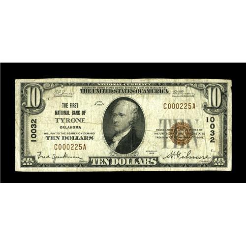 <B>Tyrone, OK</B></I> - $10 1929 Ty. 1 <B>The First NB</B></I> Ch. # 10032<BR>This bank offers collectors one of their few chances to obtain a note from any Oklahoma panhandle community. <B>Fine+,</B></I> and likely to see considerable bidding, with a realization in the range of...<BR><BR><b>Shipping:</b> Coin/Currency (<a target="_blank" href="http://www.heritageauctions.com/common/shipping.php">view shipping information</a>)