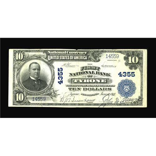 <B>Tyrone, PA</B></I> - $10 1902 Plain Back Fr. 627 <B>The First NB</B></I> Ch. # 4355<BR><B>Extremely Fine,</B></I> but with a separation beginning at the heavier central fold. Darkly stamped officers' signatures are noted, as is the bright and crackling-fresh paper. This is the later variety with the two bank serials rather than one bank and one treasury serial, and will likely sell for no less than...<BR><BR><b>Shipping:</b> Coins & Currency (<a target="_blank" href="http://www.heritageauctions.com/common/shipping.php">view shipping information</a>)