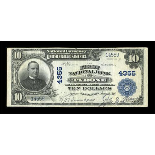 <B>Tyrone, PA</B></I> - $10 1902 Plain Back Fr. 627 <B>The First NB</B></I> Ch. # 4355<BR> This <B>Extremely Fine </B></I>Plain Back has the beginnings of separation along the top heavy fold, from the note being folded for a long time, as the paper quality is excellent.<BR><BR><b>Shipping:</b> Coins & Currency (<a target="_blank" href="http://www.heritageauctions.com/common/shipping.php">view shipping information</a>)