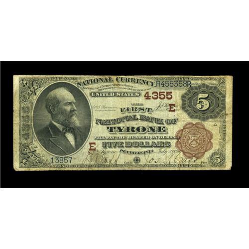 <B>Tyrone, PA</B></I> - $5 1882 Brown Back Fr. 471 <B>The First NB </B></I> Ch. # (E)4355<BR>Of the 15 large notes currently in the census, one third of them are Brown Backs. This institution incorporated Blair County into its moniker in 1932. <B>Fine.</B></I>