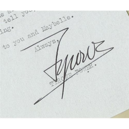 <B>Tyrone Power Signed Letter to Clifton Webb, with Photo.</B></I> A single-page typed letter dated April 27, 1951, and signed by Power in black ink. It reads in part: "It won't be long until we'll be seeing you -- should be home about the 20th May. Lots of stories to tell you, hope you'll save us some evening." Also included is an b&w 8" x 10" photo of Power in an unknown production. In overall Very Fine condition with mild wear and a rusty paperclip mark to the letter.<BR><BR><b>Shipping:</b> Flat Material, Small (<a target="_blank" href="http://www.heritageauctions.com/common/shipping.php">view shipping information</a>)