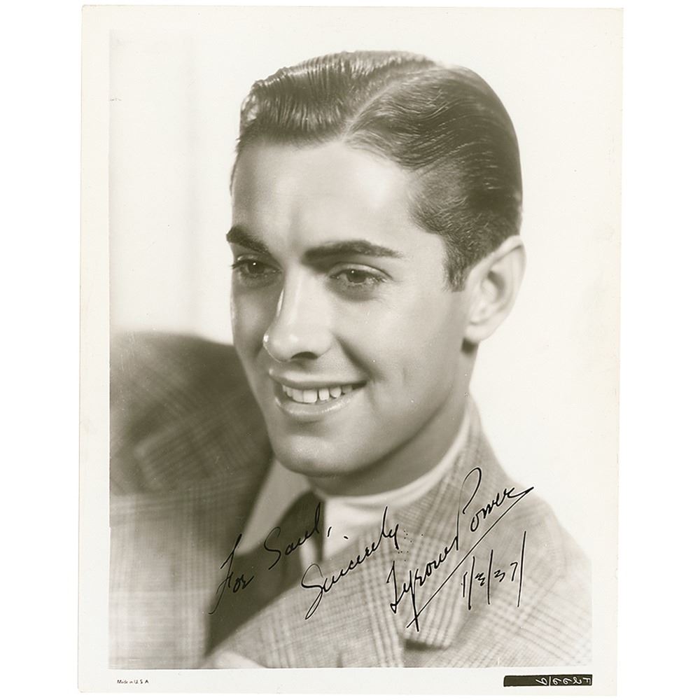 Handsome and early vintage glossy 8 x 10 head-and-shoulders photo of Power with slicked-back hair, signed and inscribed in-person in fountain pen, "For Saul, Sincerely, Tyrone Power 1/3/37." Reverse of photo bears a collector's stamp date of January 3, 1937, the date the signature was acquired. In fine condition.