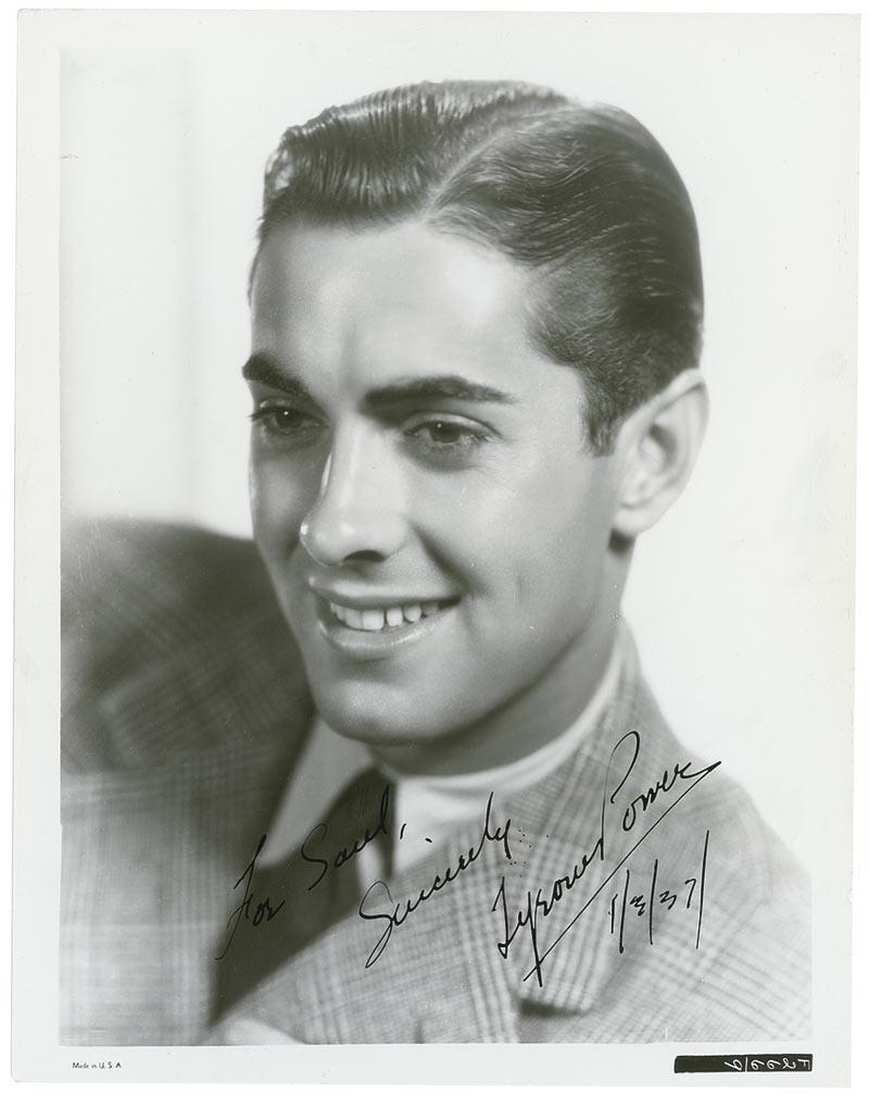 Handsome and early vintage glossy 8 x 10 photo, signed and inscribed in-person in fountain pen “For Saul, Sincerely, Tyrone Power 1/3/37.” Reverse of photo bears collector’s stamp date of January 3, 1937, the date the signature was acquired. In fine condition, with a few scattered light surface marks and some light toning along left border. Saul Goodman Collection.