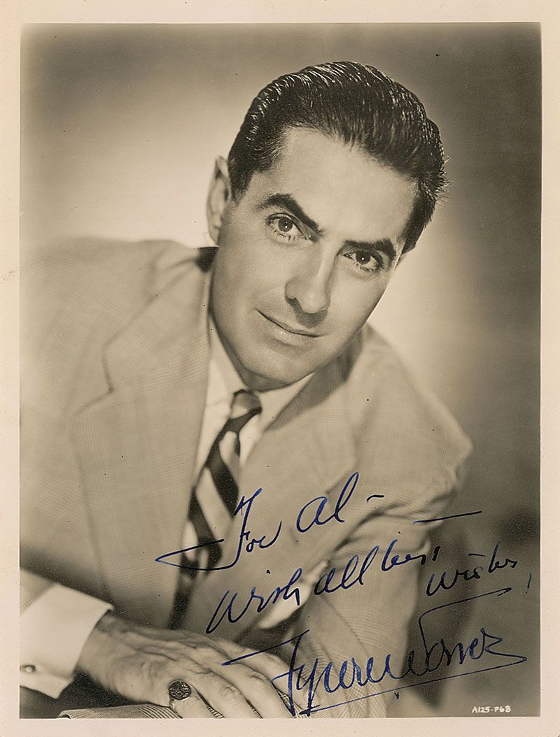 Handsome vintage matte-finish 6.5 x 8.5 head-and-shoulders photo of Power in a suit and tie, signed and inscribed in fountain pen, “For Al—With all best wishes, Tyrone Power.” In fine condition.