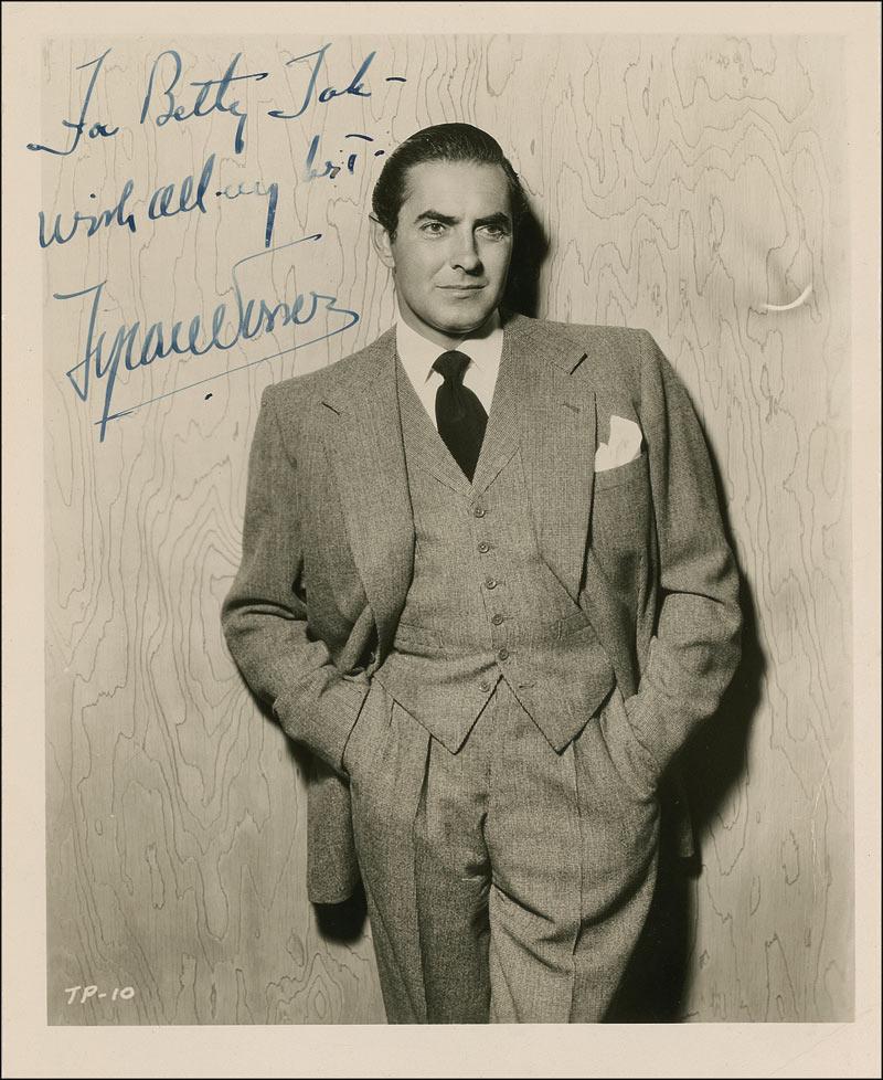 Vintage glossy 8 x 10 photo, signed in fountain pen, “Tyrone Powell,” and inscribed in another hand. In fine condition, with scattered creasing, a few creases touching his face.