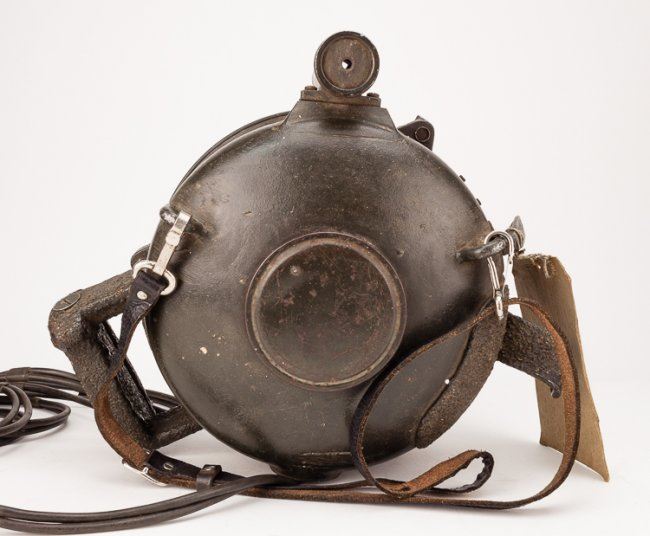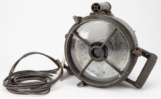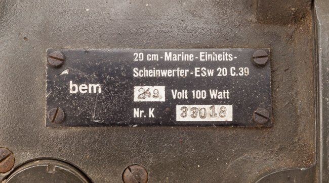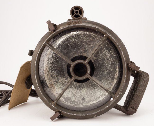 An terrific identified relic, portable 250 volt 100 watt Morse signaling lamp from U-249, taken from the vessel following its The solidly-constructed 10" diameter lamp is weatherproof, with three clamps securing the shielded glass face to the front of the lamp. Two switches are present: one is an integral part of the left-hand grip which when squeezed activates the switch turning on the lamp. A toggle switch at right permits moves a shield onto and away from the bulb, alternately casting a light and dimming it. A crude sight is fitted at top to locate the sender's recipient. The lamp also bears a maker's plate attached at right. A neck strap is fitted to support the lamp, though it may be a replacement. An approx. six foot original electrical cord also remains, terminating in two bare leads. This lamp is accompanied by an attached ca. 1950s cardboard tag with mounted typed note, presumable by R.N. AB Kenneth Rilett who recovered the other U-249 items in this sale. The typed provenance reads, in part: "GERMAN SUBMARINE U-249 This searchlight came from the German Submarine U-249 which was the first submarine to surrender on May 9th 1945...The Submarine was stripped of all equipment before touring some British ports together with the U-776. The lamp which I used for many years and other items which were given away...". Royal Navy AB Kenneth Rilett was detailed by Capt. N. J. Weir, the officer overseeing the surrender, to assist in escorting the arrested U-249 crewmen to an internment camp. He then apparently returned to the submarine for salvage duty where he recovered this lamp. Copies of Rilett's orders to attend the vessel's prisoners and an Admiralty envelope addressed to Rilett sent by an Admiralty salvage officer in Bath, near Portland, date unknown are included. An identical signal lamp is pictured on page 322 of Gordon Williamson's book: "Torpedo Los!". Provenance: R.N. Seaman Kenneth Rilett; The War Museum. A printed color certificate of provenance and historical report with 20 photos of the sub's history, service and surrender will accompany this lot.