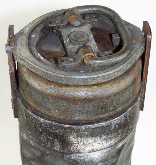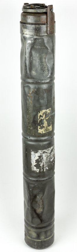 Original German U-boat 88mm. storage cannister for 88mm. shells used in the vessel's feck gun. This example was removed from an unidentified U-boat which surrendered at Portsmouth, RI at war's end in 1945. The canister, about 40" long and 5 1/2" dia. was designed to maintain a waterproof atmosphere within to keep harmful seawater from damaging the shell carried within. Typically, these canisters were stowed on wood racks fixed to the vessel at either side of the cannon. The canister is tooled of magnetic sheet metal brazed at the seam with three sets of double-impressed rings to keep the contents safe. Further, the rotating end cap has a locking mechanism. The canister is painted gray-green and dated, 1942, with some dents as one would expect. A great relic!