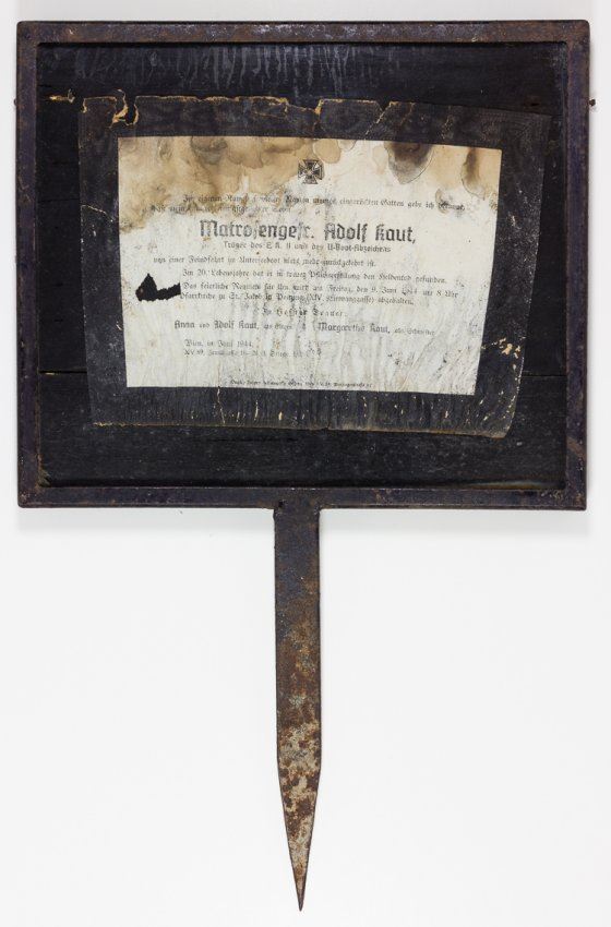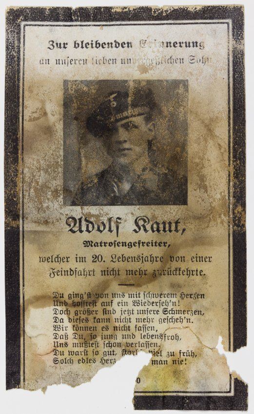 Saddening lot of two items surrounding the death of 20 year-old U-boat man Adolf Kaut, a recipient of the Iron Cross, 2nd Class and the U-Boat Badge. Included is: a memorial marker bearing Kaut's death notice within, a 10" x 8 1/2" steel frame with ground spike, wood lathe on verso, containing a 8" x 6" black-bordered death notice mentioning his death in action while at sea in U-boat service, June 9, 1944, his various awards, memorial service arrangements, and the names of his next of kin. Also present is Kaut's black bordered memorial card picturing the young seaman which was likely also contained within the marker. Both items water-damaged. U-613, aboard which Kaut served, was depth charged and sunk north of the Azores on July 23, 1943 resulting in the loss of all hands. Whether a funeral service was held for Kaut and a relic of his life was buried in place of his remains is unknown - if so, this relic may have served as a temporary grave marker. Provenance: TIME-LIFE Collection, The War Museum.