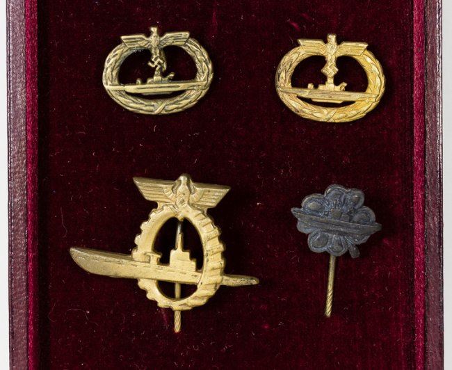 Lot of four U-boat stickpins in velvet-lined red leather 1940's jewelry case. Two pins bear representations of U-boat badges and have excellent detail. A third pin is the Underseas Boat School stickpin. The Underseas Boat School of Neustadt was subordinated to the B.d.U./Org in 1940 and renamed the 1st Undersea Boat School and transferred to Pillau on May 1, 1940. The symbol is often also described as a Kriegsmarine sub-builders and repair dock insignia. The fourth pin displays a U-boat atop a four-leaf clover. Provenance: TIME-LIFE Collection; The War Museum.