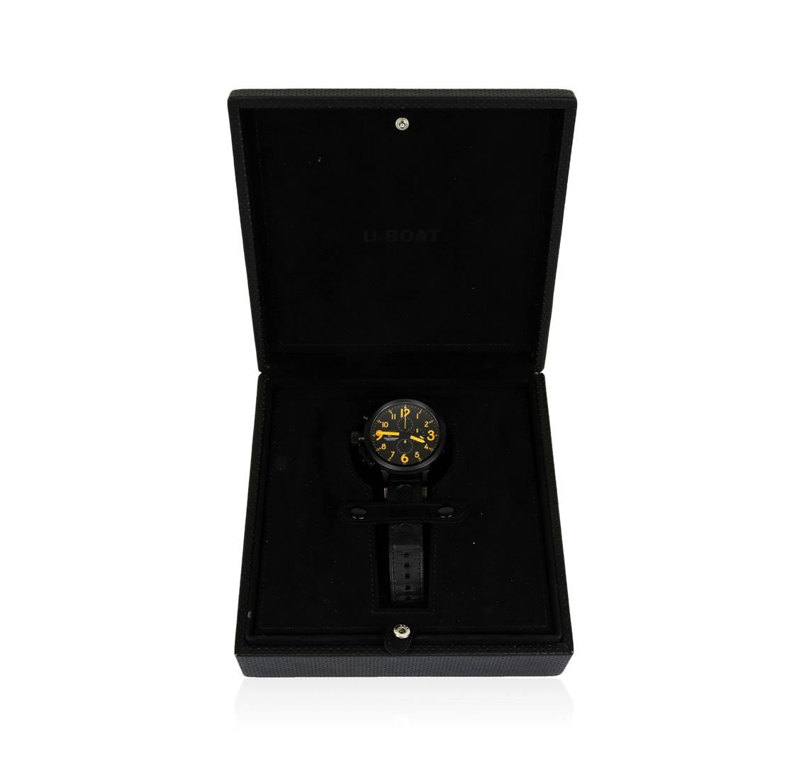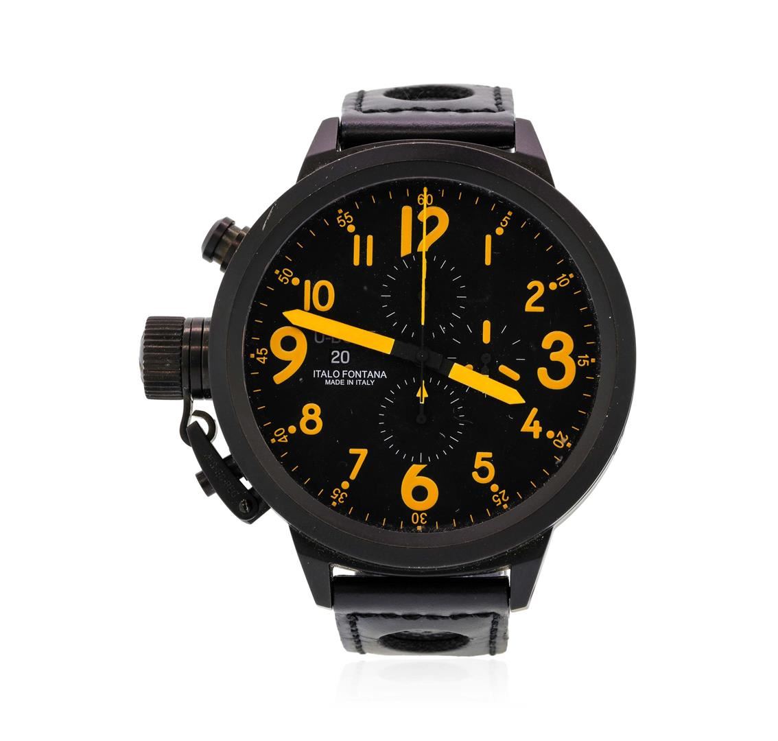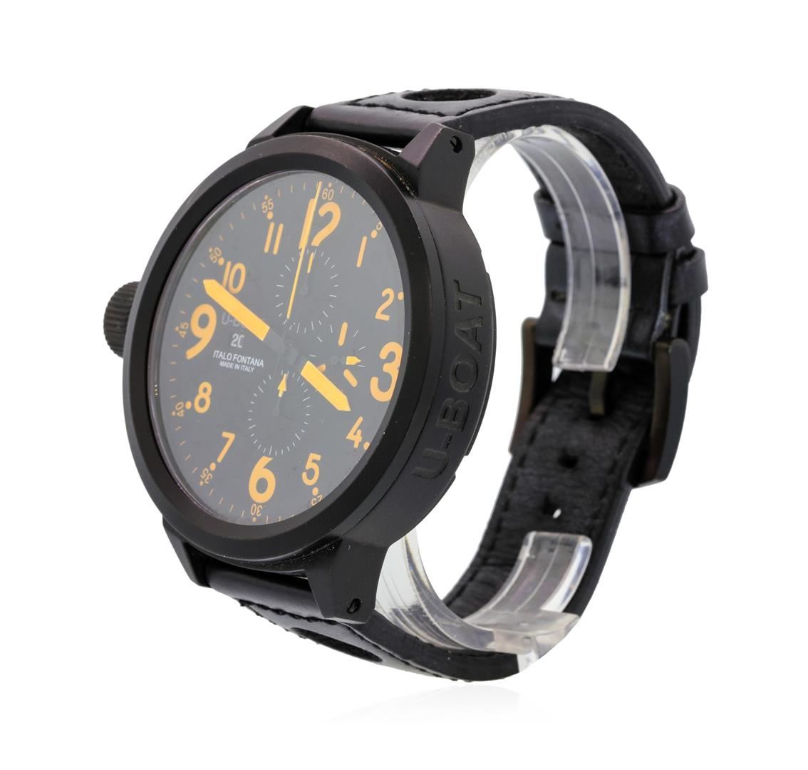 U-Boat Italo Fontana Flightdeck Chronograph U-7750 PVD Automatic Watch. The Specifications are as follows: Model: 6122, Original MSRP: $4720, Case: Coated Black PVD, Bezel: Black, Movement: Automatic, Crystal: Scratch Resistant Sapphire, Bracelet: Calfskin, Dial: Black with Orange Arabic Numbers, Luminous Hands/Indexes, Crown on Left, Size: 50mm, Water Resistance: 100 meters, Condition: Pre-owned comes with Box & Booklets.