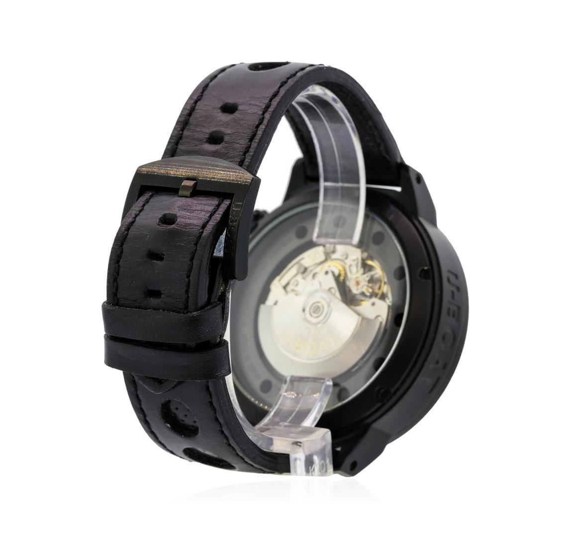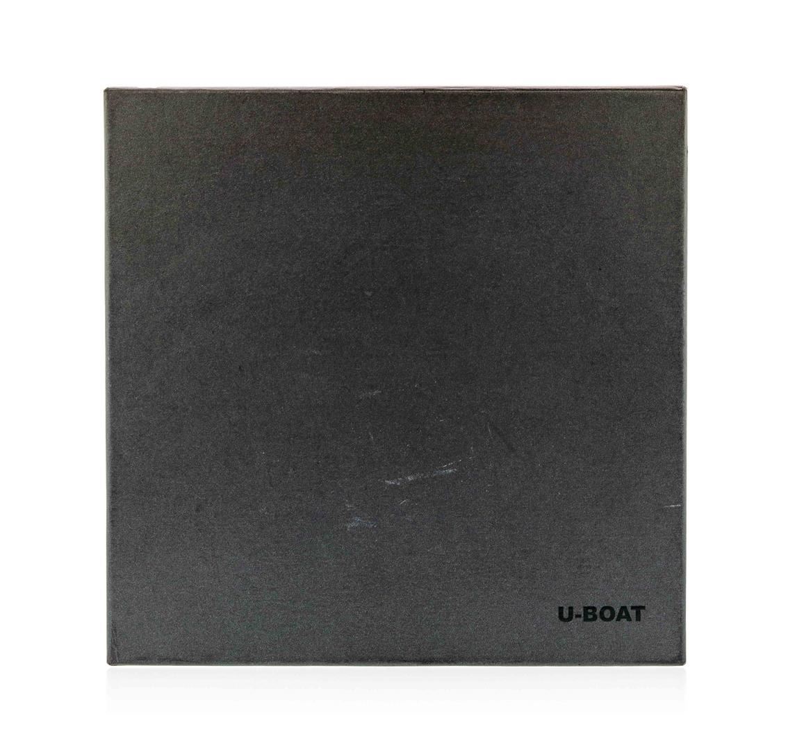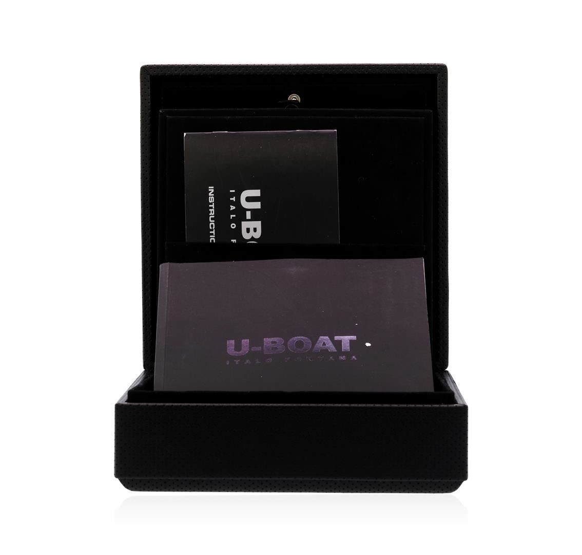 U-Boat Italo Fontana Flightdeck Chronograph U-7750 PVD Automatic Watch. The Specifications are as follows: Model: 6122, Original MSRP: $4720, Case: Coated Black PVD, Bezel: Black, Movement: Automatic, Crystal: Scratch Resistant Sapphire, Bracelet: Calfskin, Dial: Black with Orange Arabic Numbers, Luminous Hands/Indexes, Crown on Left, Size: 50mm, Water Resistance: 100 meters, Condition: Pre-owned comes with Box & Booklets.