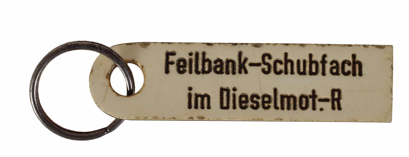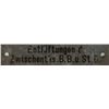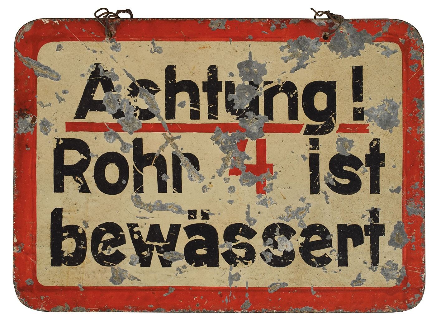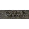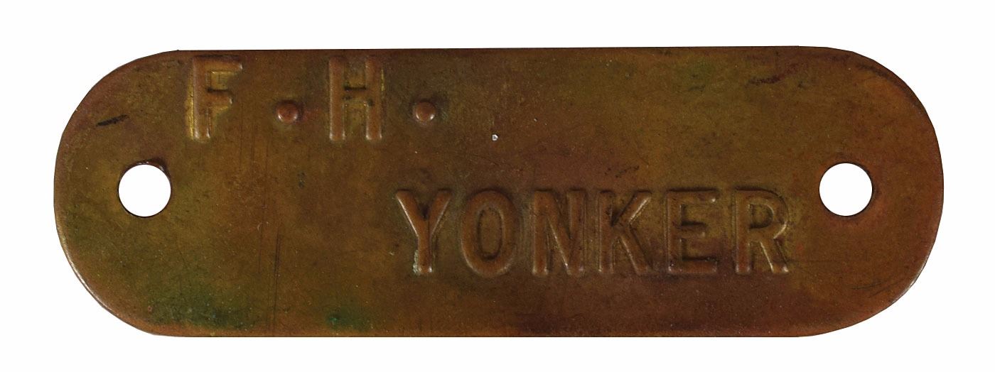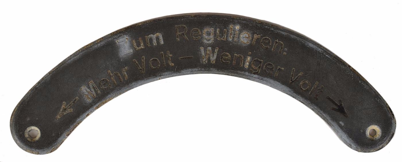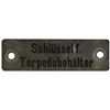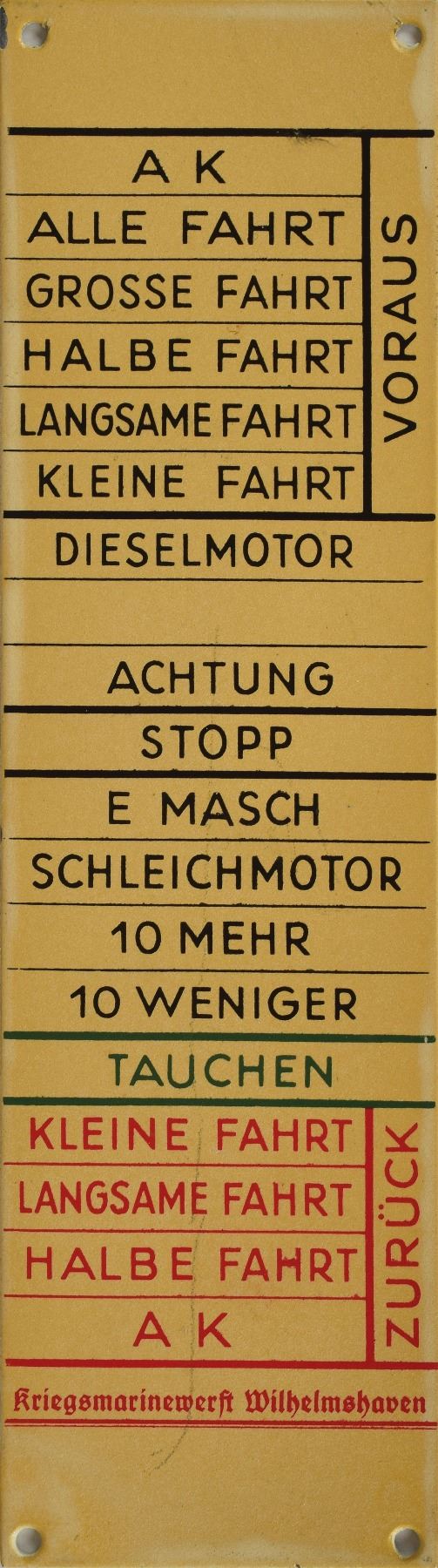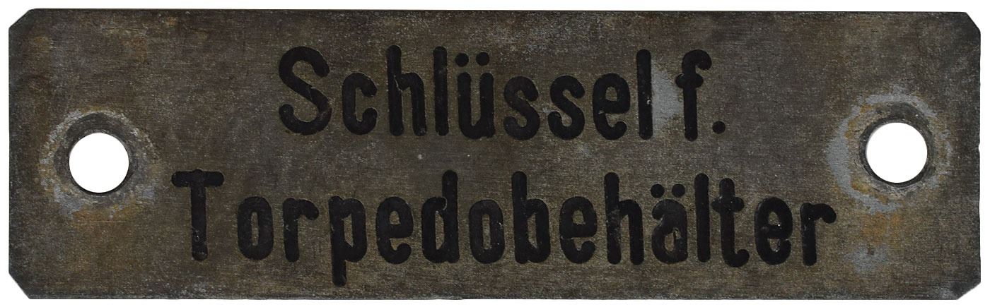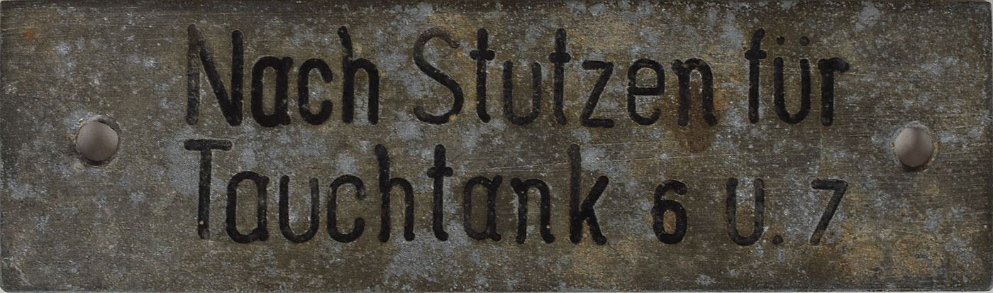 Collection of eleven original WWII-era signs and tags recovered from German U-Boats, ranging in size from 1.75 x .5 to 3.25 x 11.5, including: an enameled engine control panel tag from a conning tower, marked with various engine speeds and settings; a "Nach Stutzen fur Tauchtank 6 u. 7" tag from U-118; a "Stosskreis-Variometer" tag from U-118; a "Entluftungen d. Zwischentks" tag from U-118; a "Schlusself. Torpedobehalter" tag from U-30; a brass "F. H. Yonker" tag; a key tag for the diesel engine room control panel from U-1209; a "Zum Regulieren" tag from an electrical control panel; a "Siemens-Schuckert" tag; a Siemens logo motor badge; and a red-bordered warning sign, "Actung! Rohr 4 ist bewassert [Attention! Pipe 4 is flooded]." In overall very good to fine condition, with heavier wear to some of the signs. Accompanied by a certificate of authenticity signed by Rodney Hilton Brown, founder of The War Museum, a private non-profit foundation which has provided items to several noteworthy institutions including the Smithsonian.