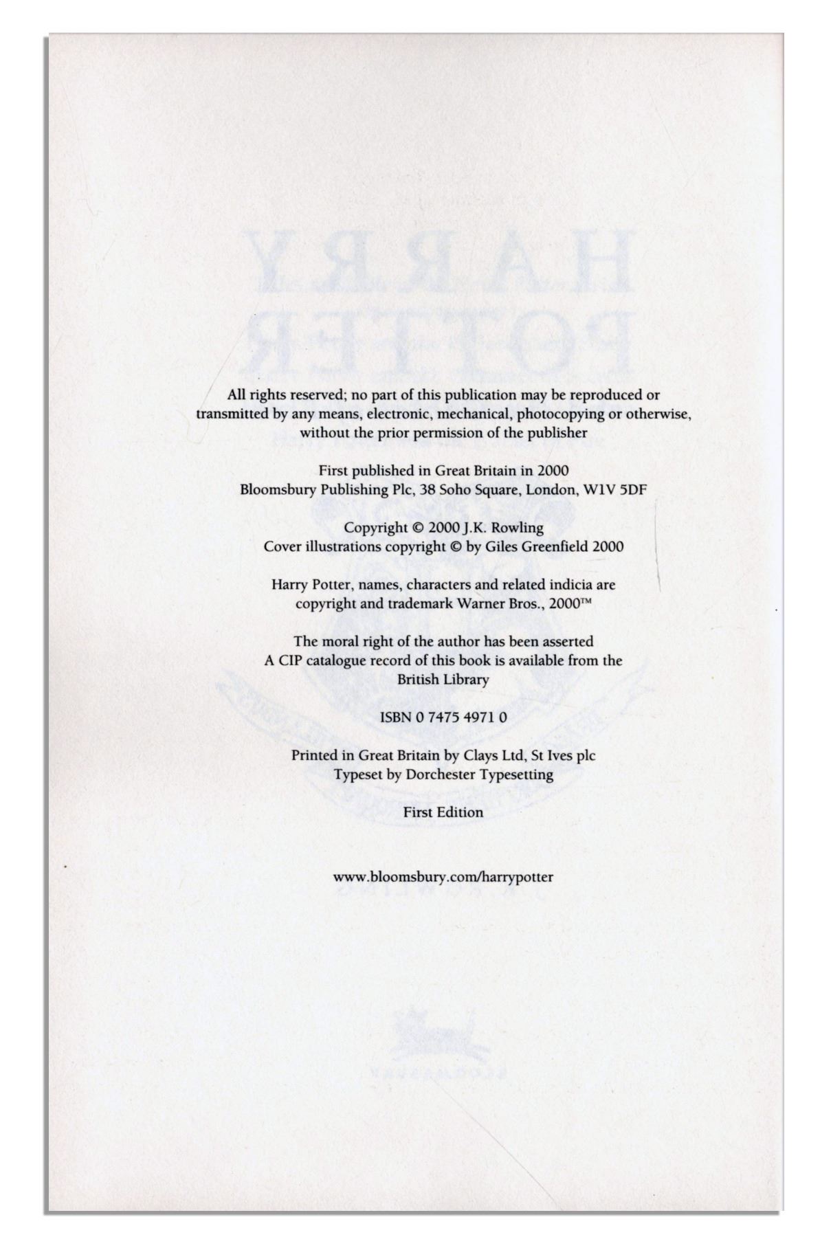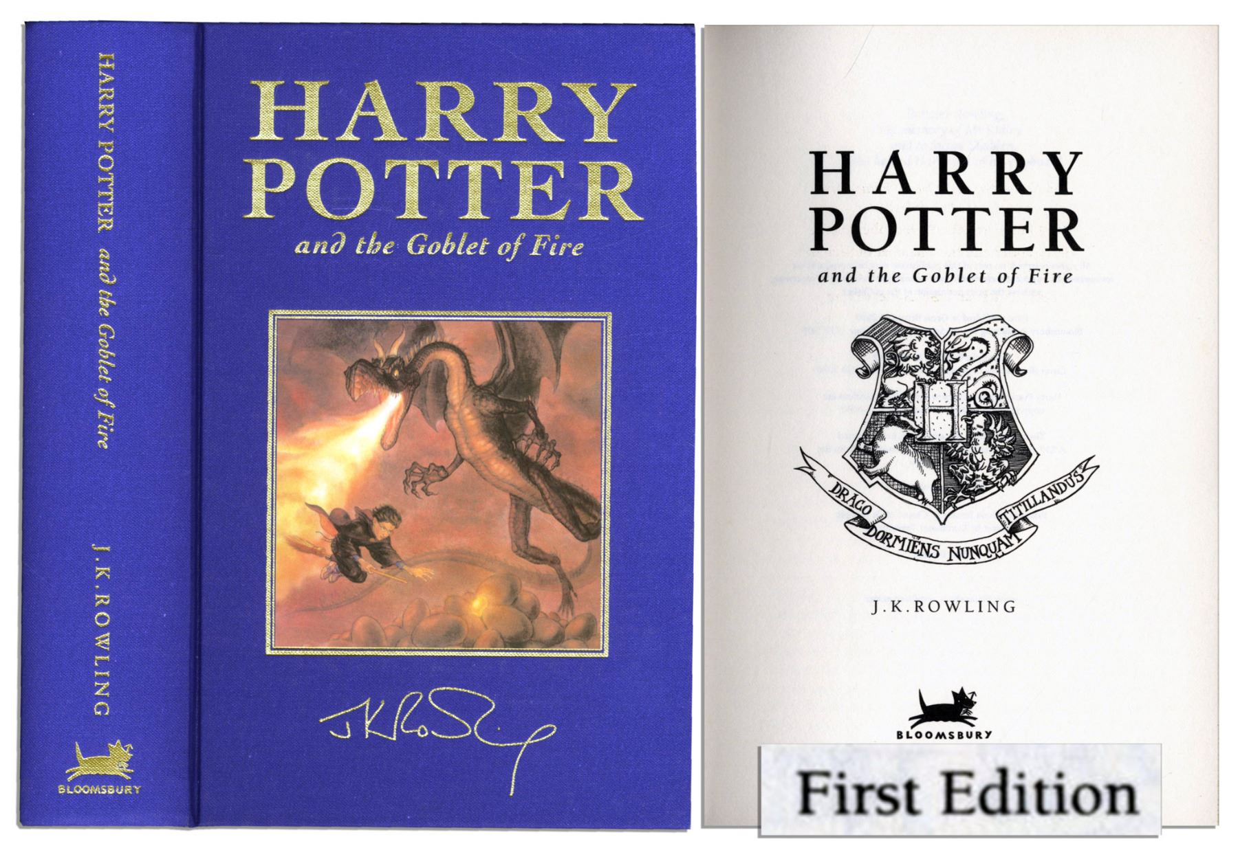 U.K. Deluxe edition of ''Harry Potter and the Goblet of Fire'' published by Bloombury: London: 2000. First edition, first printing of the fourth book in J.K. Rowling's famed series. Runs a weighty 636pp. and measures 6.25'' x 9.5''. Bound in pictorial purple cloth boards with gilt lettering and a red ribbon bookmark. All edges gilt. In near fine condition.