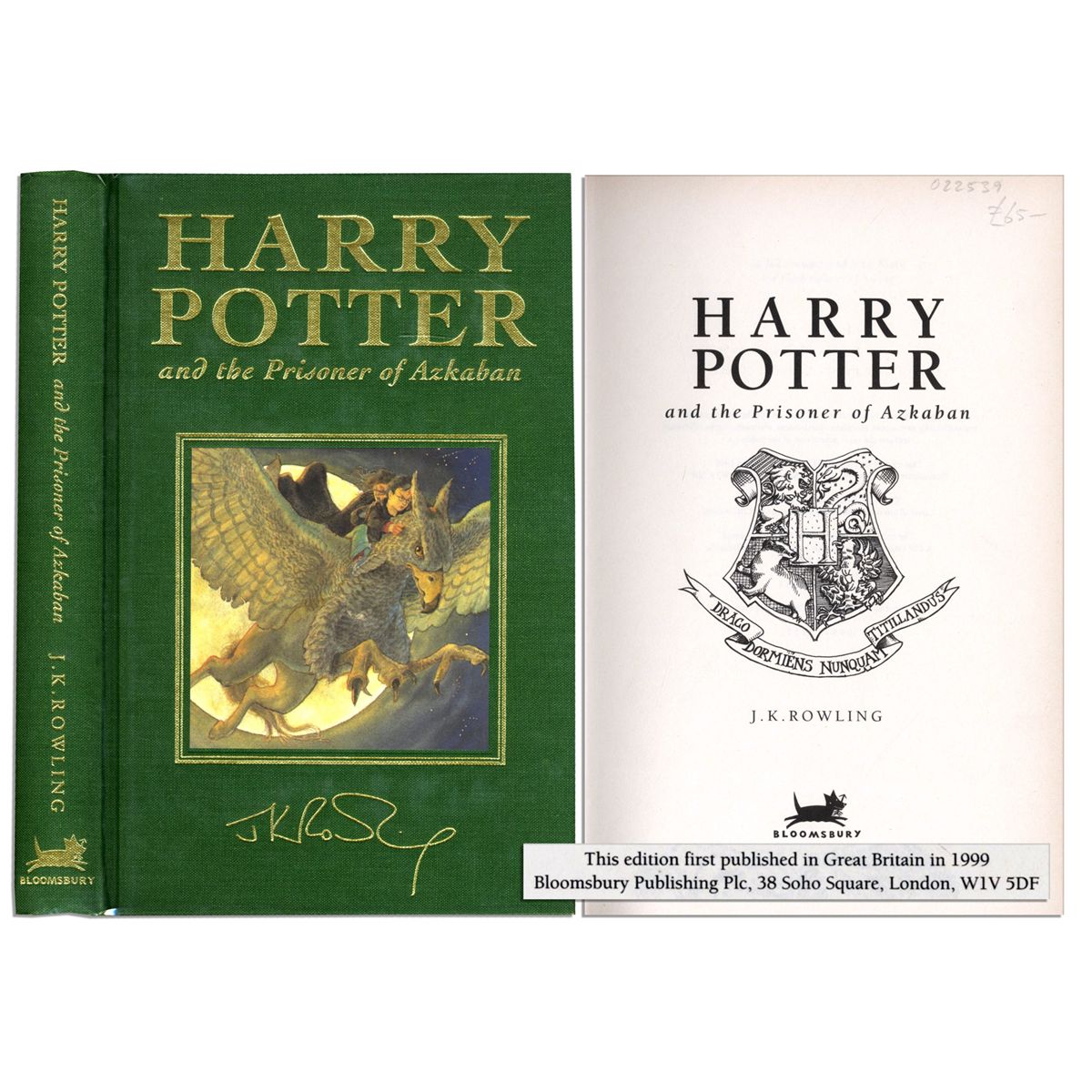 U.K. deluxe edition of ''Harry Potter and the Prisoner of Azkaban'' published by Bloombury: London: 1999. First edition, second printing. This is the rarest of the U.K. deluxe volumes and third in J.K. Rowling's hit series. Bound in original green illustrated cloth boards with gilt lettering. All edges gilt. Runs 317pp. A tiny crease to the top edge of page 232, else fine.
