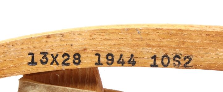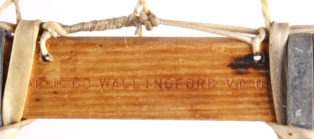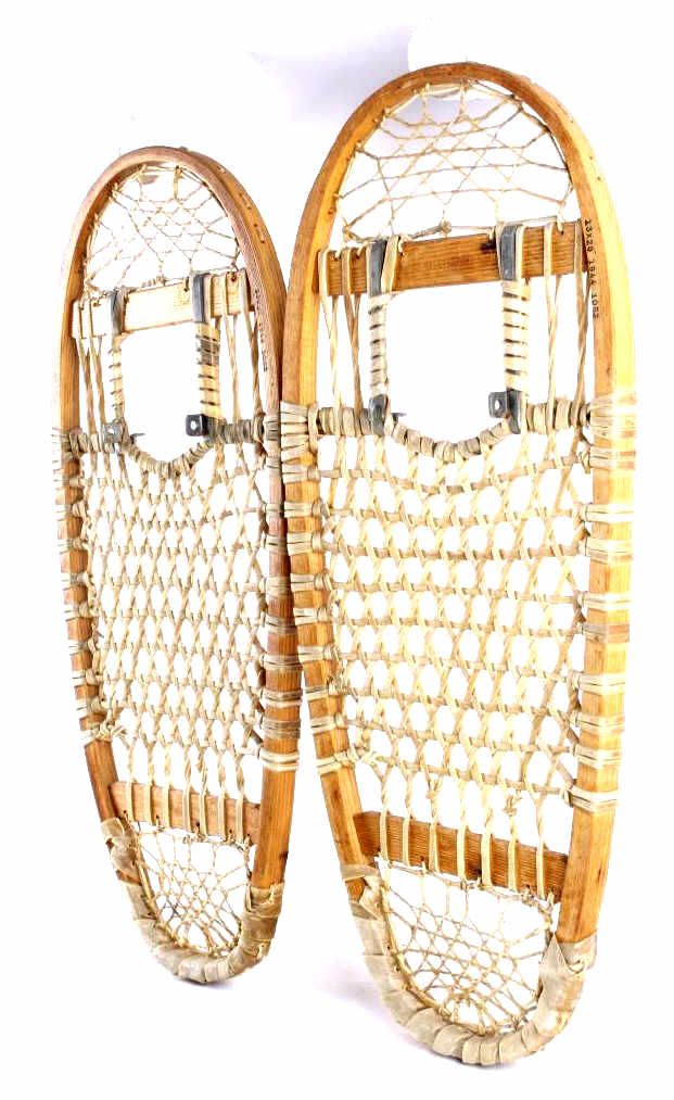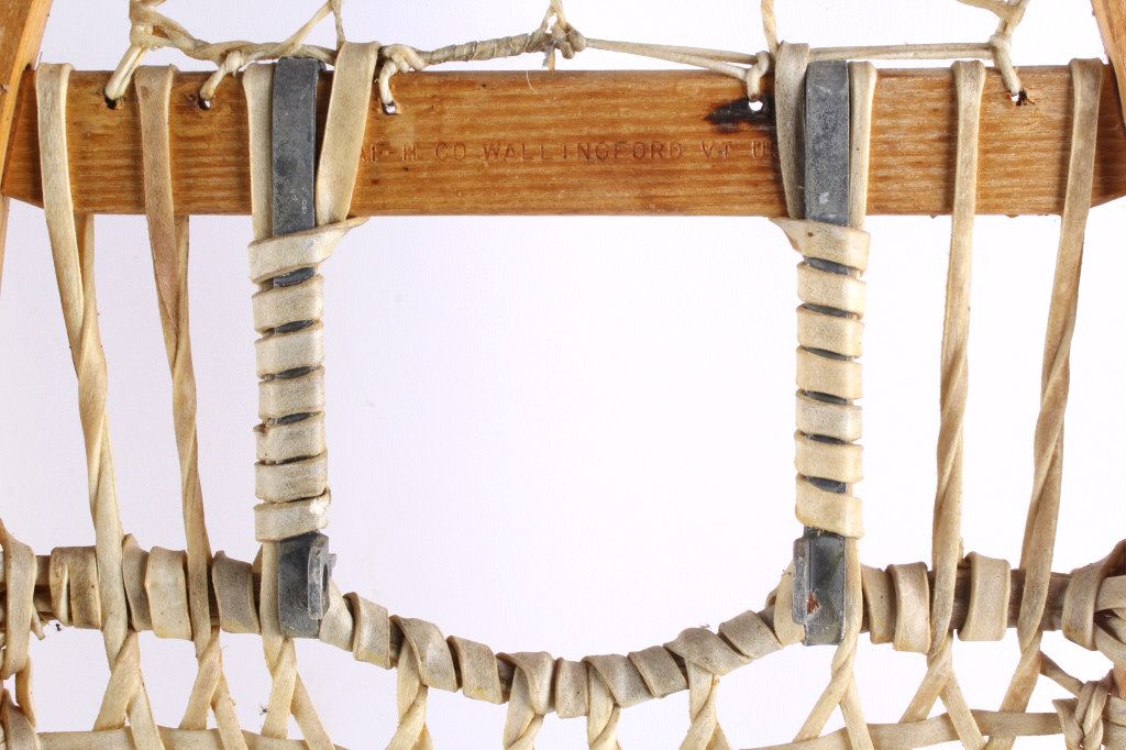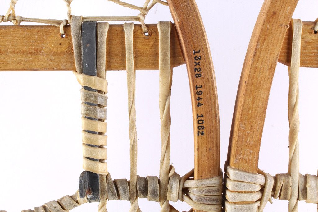 The lot features a set of Bear Paw wood and rawhide snowshoes. These are marked, "A.F.-H Co. Wallingford Vt. U.S. 13x28 1944 1062." The set is made for the United States 10th Mountain Division and show excellent condition. 1942. Measures 13"x28"