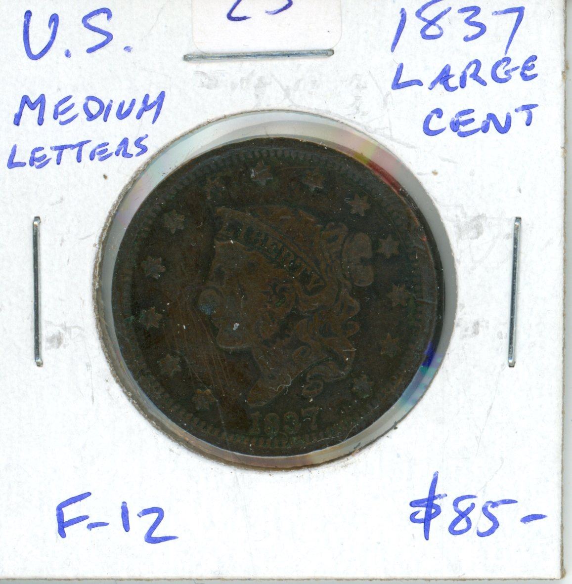 U.S. 1837 Matron Head Large Cent. Medium Letters. F-12. Scarce.