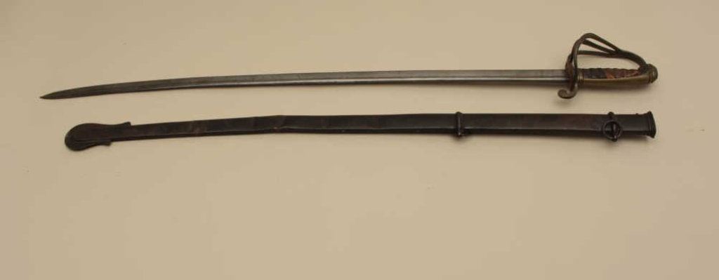 Ames/Springfield; blade is good overall, grip shows some loss of leather wrap over wood base; dark patina to brass guard, scabbard displays several creases and dark patina. Est.: $400-$800.