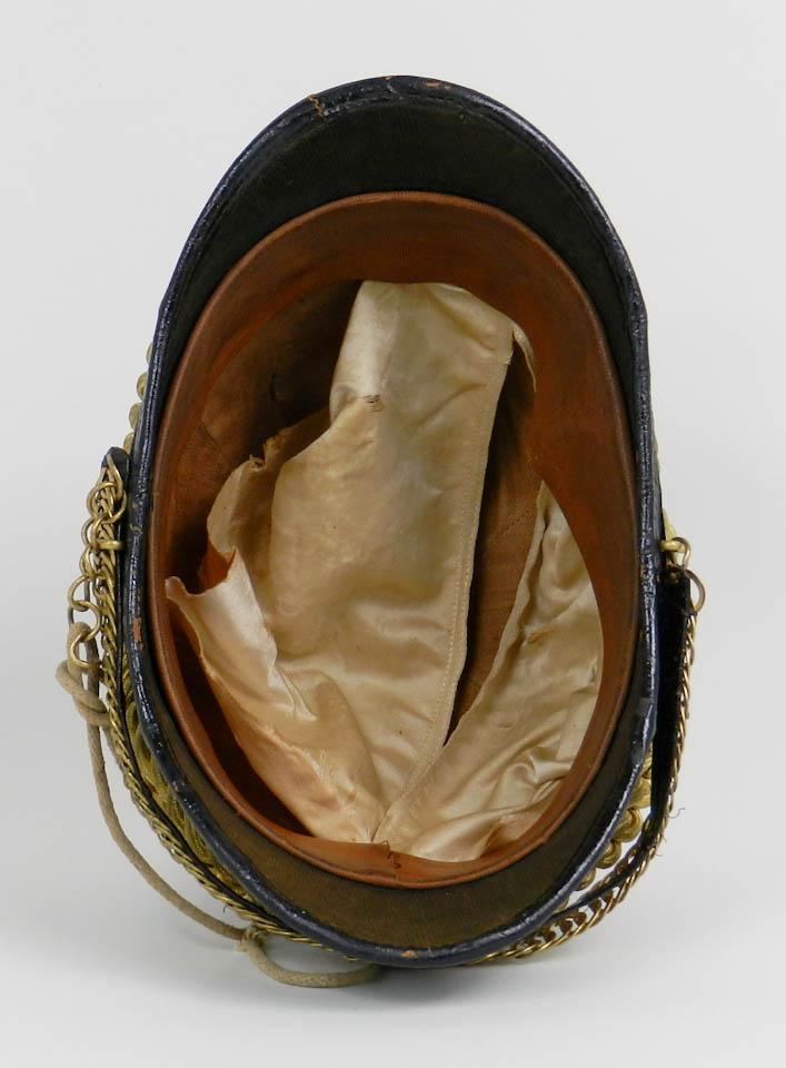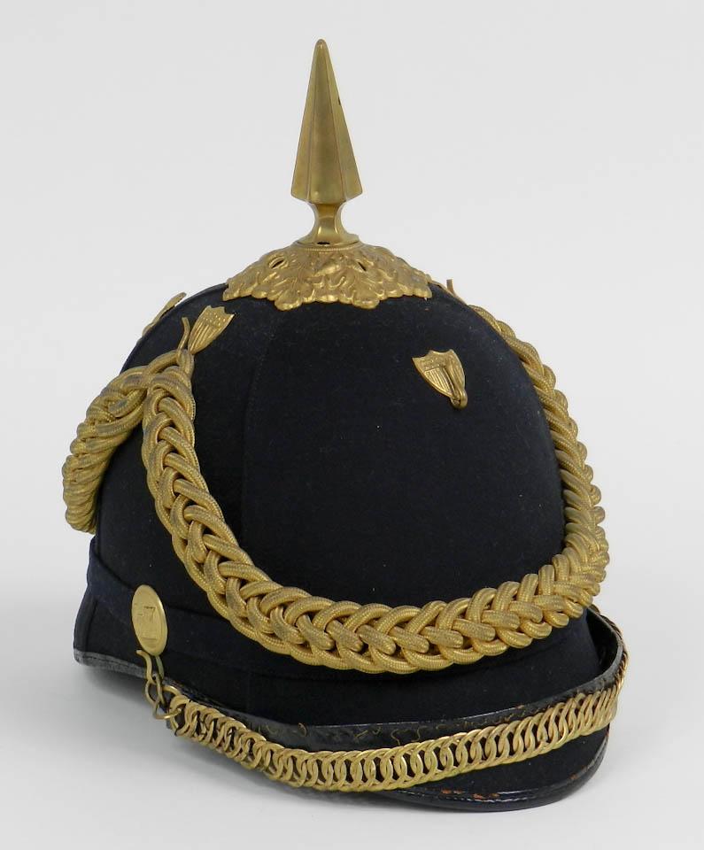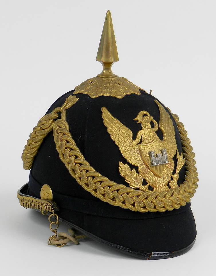 U.S. 1881 Mounted Engineer Officer's Helmet, adapted in 1881 and based on the early 1872 Cavalry pattern. The date 1881 marked a distinct shift in American military attire. U.S. Army adopted Prussian patterns instead of French designs. U.S. military lost its interest in things French following their poor showing in the Franco-Prussian War of 1870-71. Spiked tip (dismounted) with large Federal eagle. The castle motif and button indicates this hat belonged to a Dismounted Engineer. Helmet is high grade black wool over cork with stamped brass fitting and hardware. Used from 1881 to 1902. Condition is excellent with light checking to the brim edge. Sweatband is mostly complete; silk lining is present although detached. Maker's label is missing. This particular helmet is adorned with correct period gold braid. Est.: $400-$600.