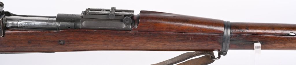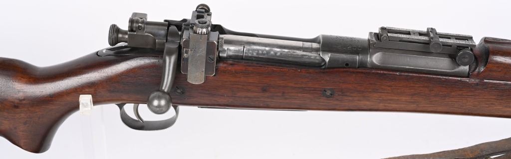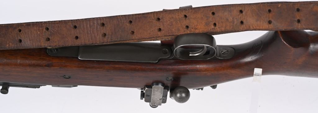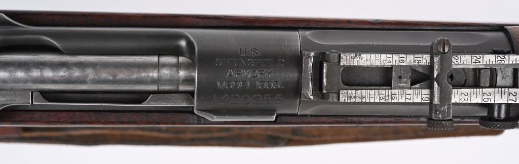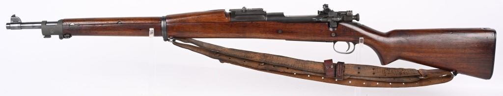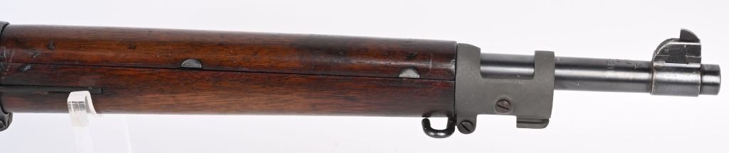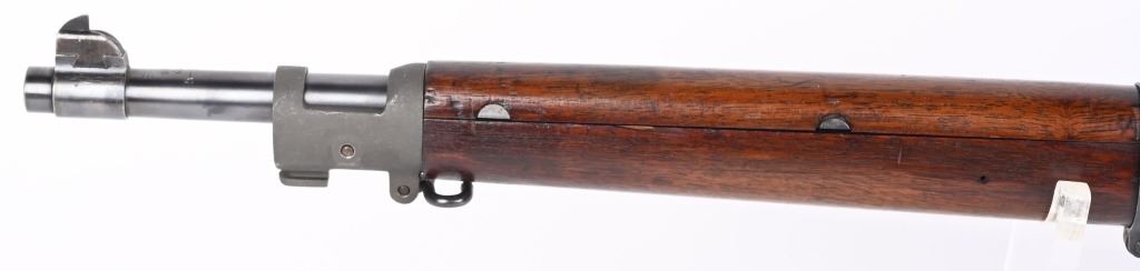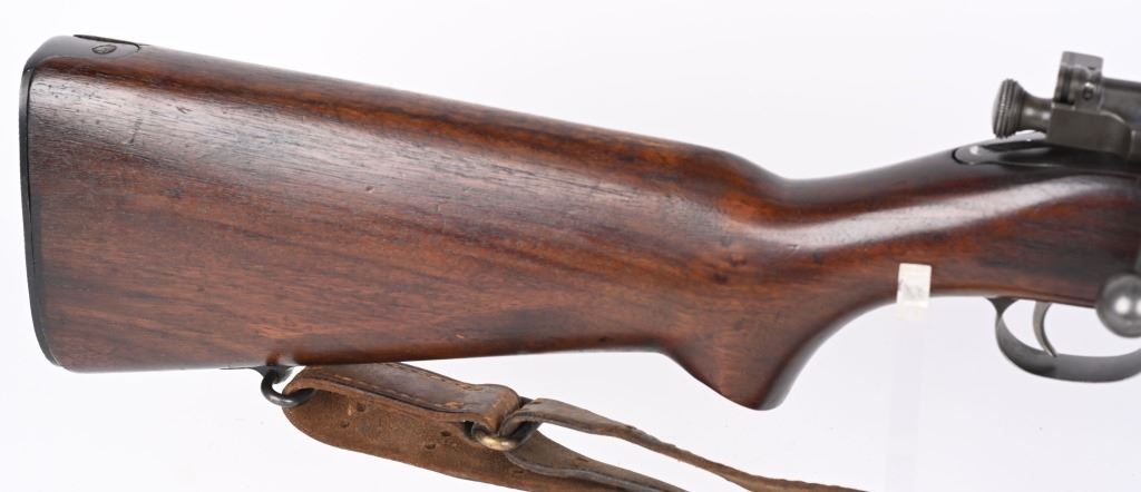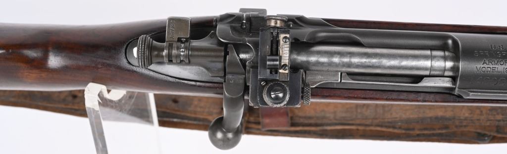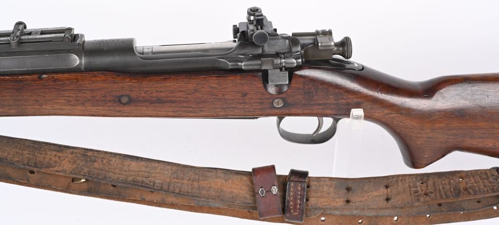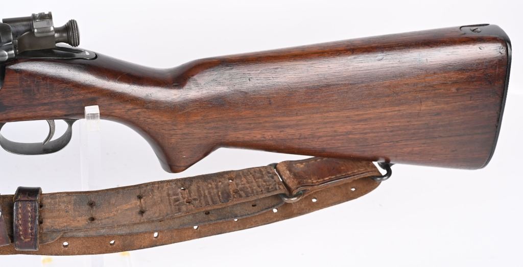 SERIAL 1420255. BARREL 24". CALIBER 30-06. BARREL DATE 5-38. According to Springfield Research, there are numerous special orders rifles made like National Match rifles. This rifle features the pistol grip C stock with SA GAW and ordnance wheel. (1943-44) , an unusual stamp on a target C stock Type 14 stock. There is no star gauge on barrel. Rifle sports a Lyman 48 peep sight with standard front & rear. There is a proof P on wrist. Bolt was polished and jeweled at one time but pattern is wearing thin. All fine blue finish with exception to front band which is parkerized and should be replace with blue example. Condition 90% blue with most wear on floor plate. Stock is excellent with sharp cartouche. and very few minor impressions. Bore is sharp. Comes with period sling. C&R