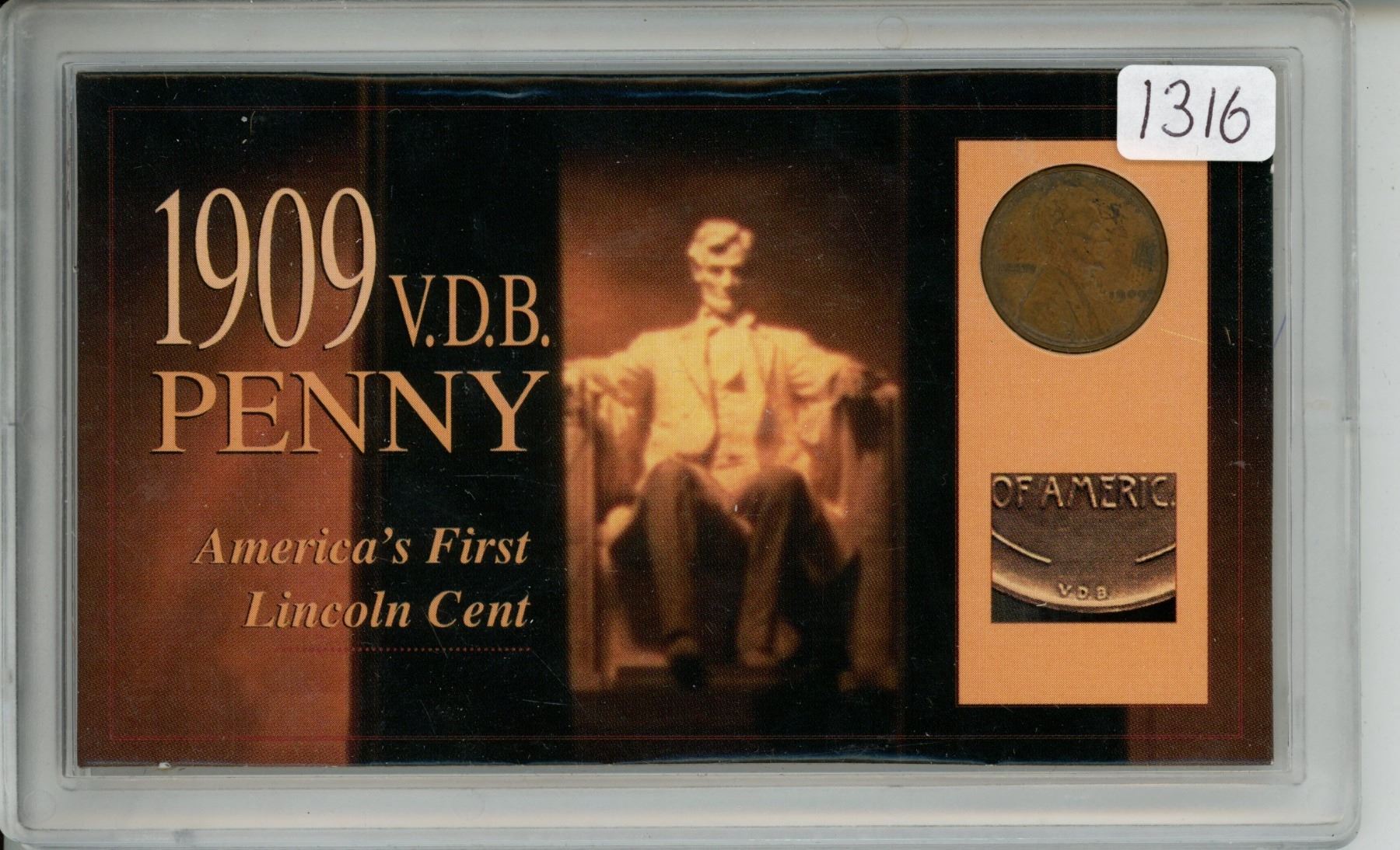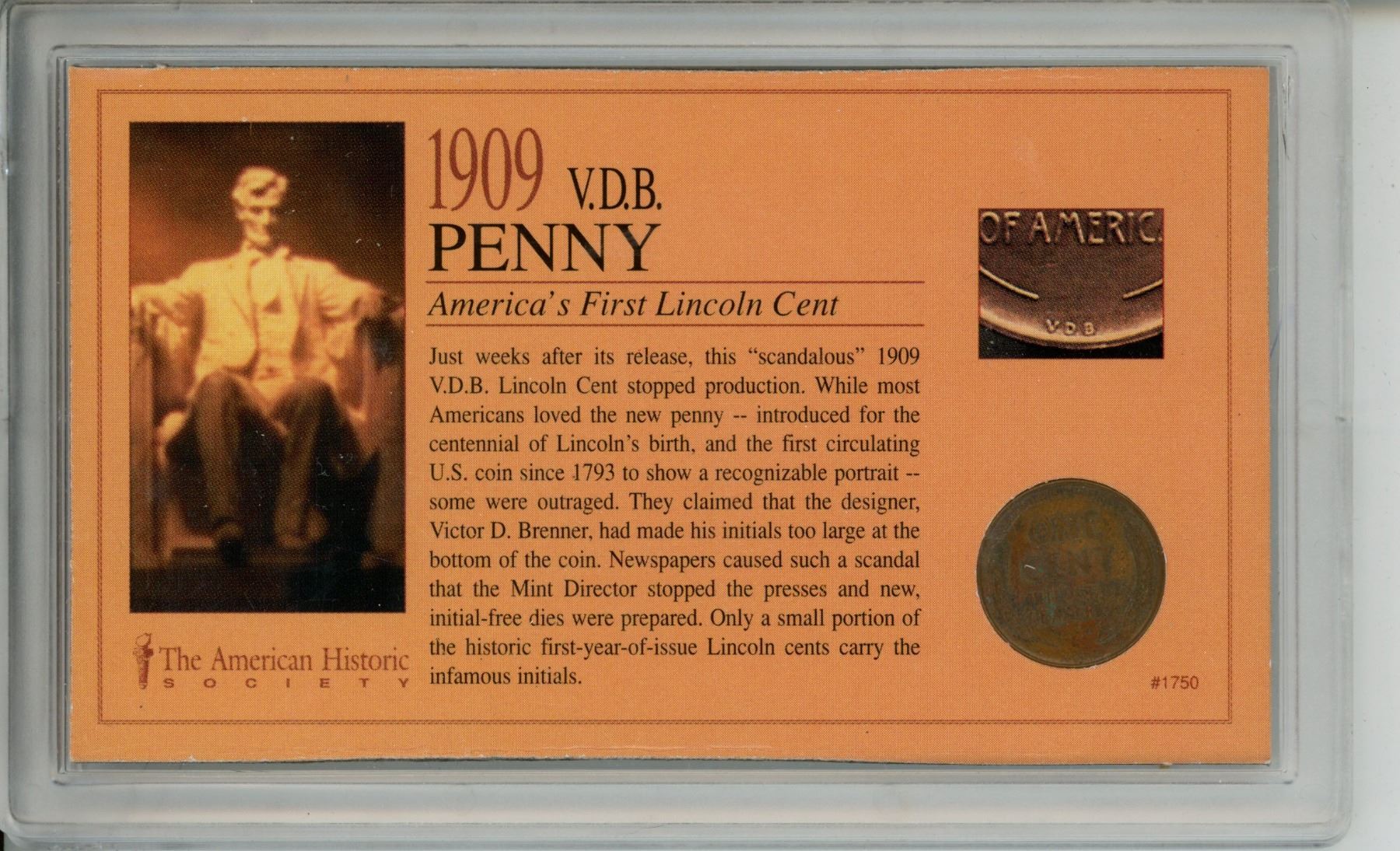 U.S. 1909 VDB Cents: America’s First Lincoln Cent. Coin grades VF-20 or better. Housed in The American Historic Society hard plastic holder.