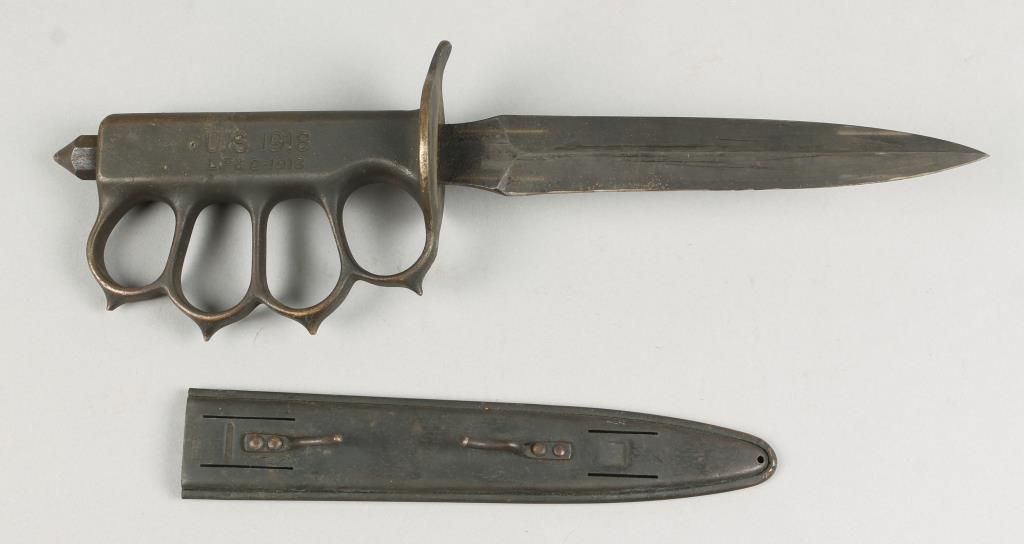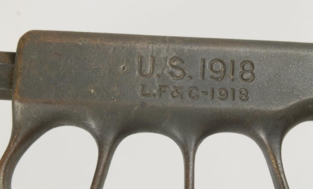 Stamped on handle "U.S 1918 LNC." Metal sheath is also marked. Hangers are present. Condition is overall good.
