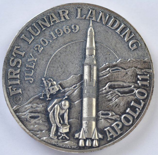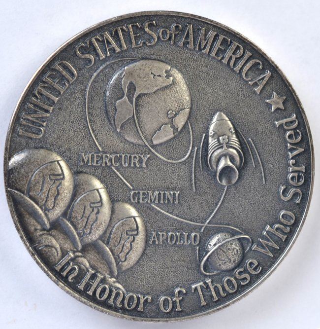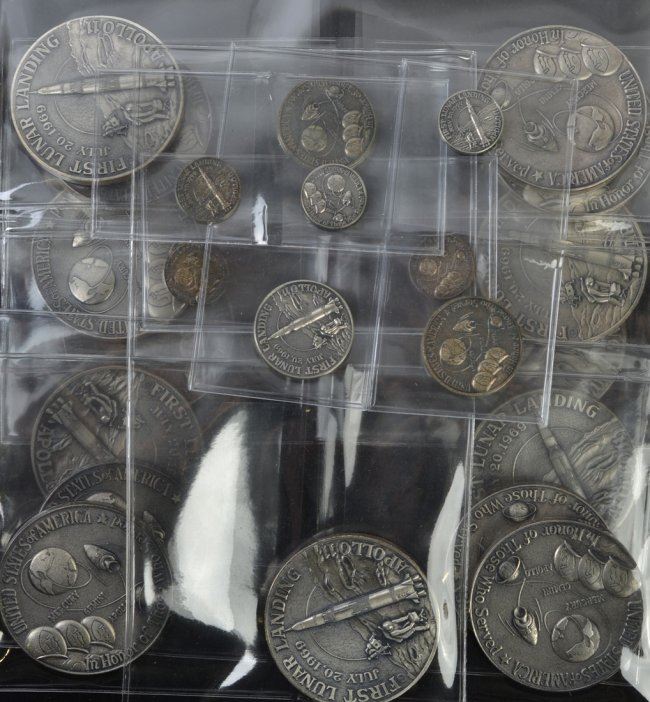 [NASA Space Exploration] Group of 15 duplicate medals all stamped "999 Fine Silver" on edge and sculpted by John Roberts. All 51mm. Some toning, otherwise Near Proof condition. Total weight 46 ozt / 1,433.2 grams. Accompanied by 8 smaller versions in sterling silver comprising three 30mm and five 20mm examples. Sterling weight 2 ozt / 62.4 grams.