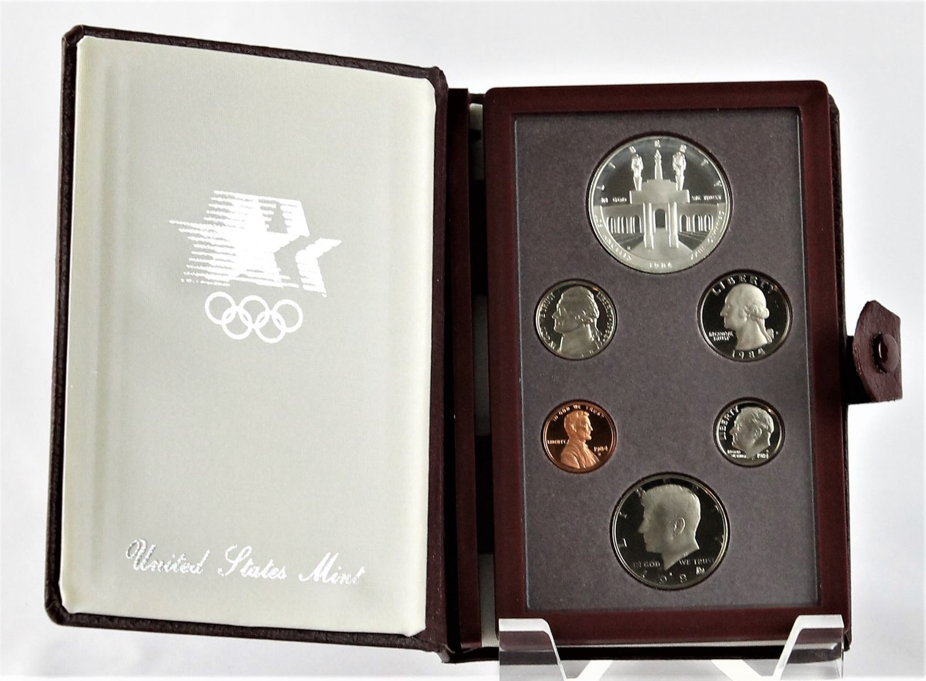 United States 1984 Prestige Set, consisting of 6 coins. Comes in a maroon, hand crafted and leather case with snap. Each coin with its own setting.
