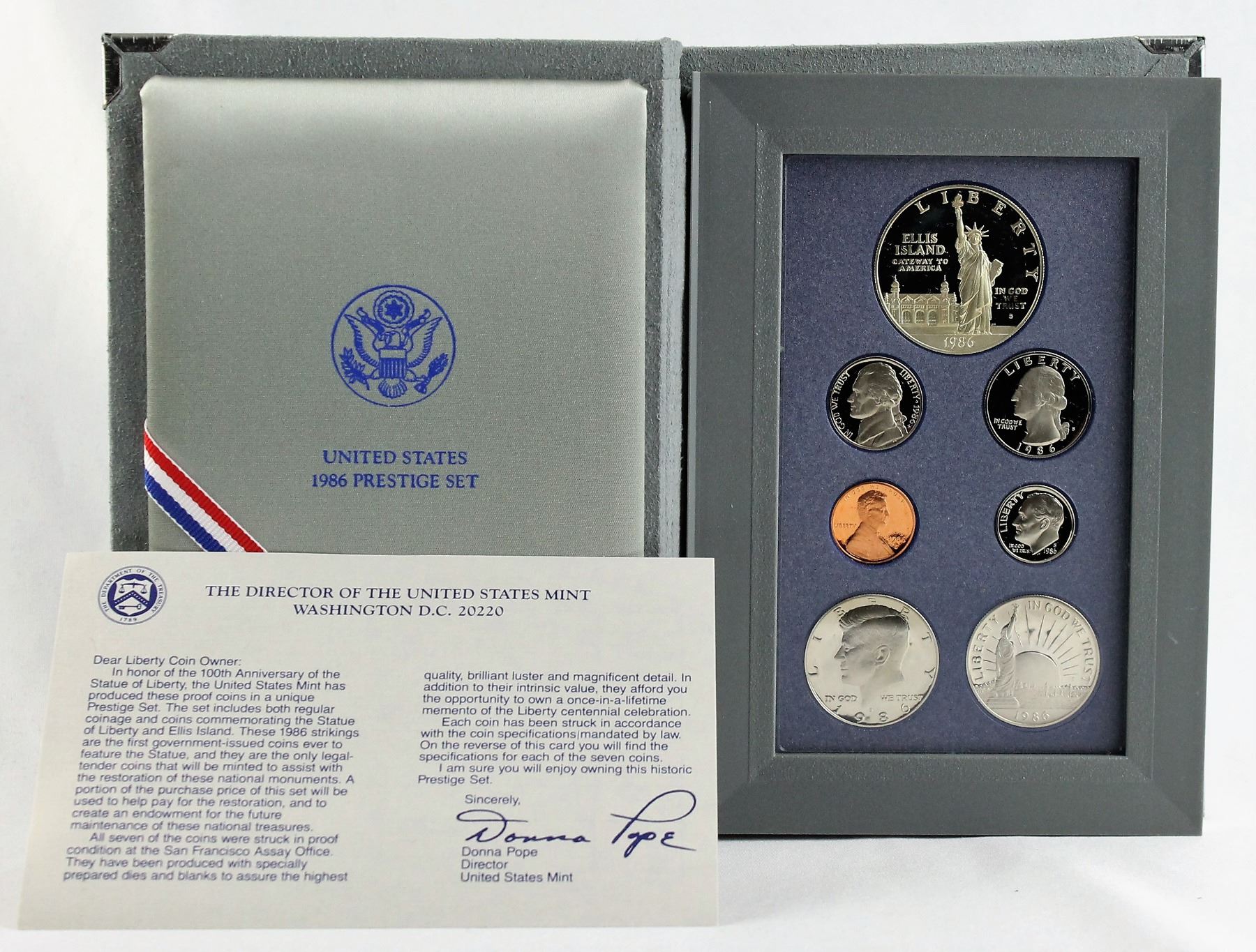 This wonderful seven-piece set includes all of the proof issue coins of 1986 as well as a commemorative Statue of Liberty proof half dollar and Silver dollar in the original U.S. Mint presentation case.
