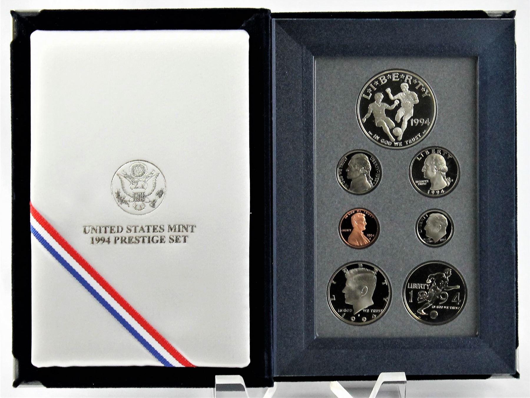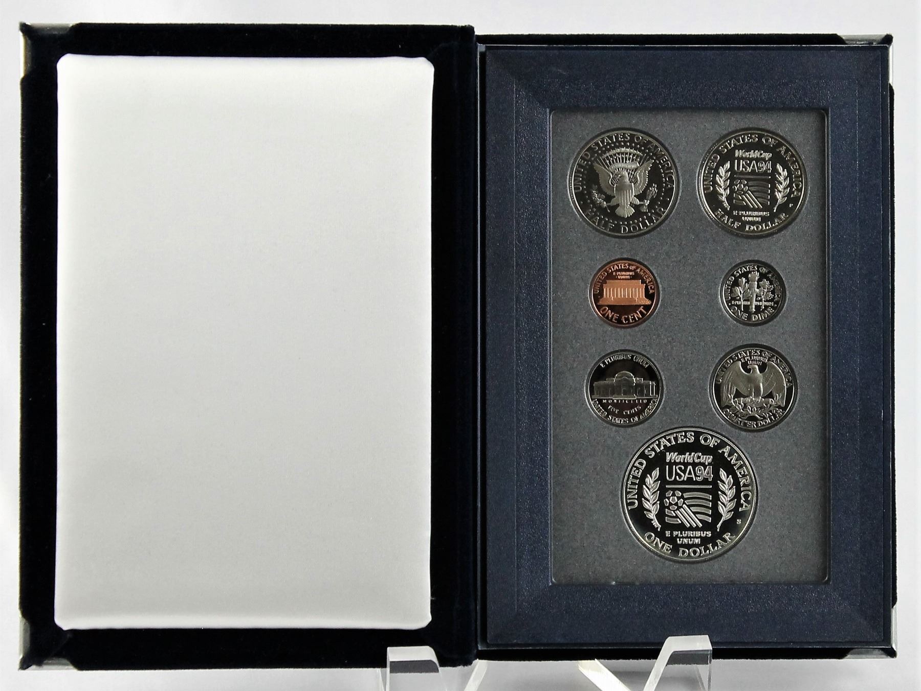 Set includes a proof example of the following coins: Lincoln Cent, Jefferson Nickel, Roosevelt Dime, Washington Quarter, Kennedy Half Dollar and a commemorative World Cup Silver dollar and clad half dollar.