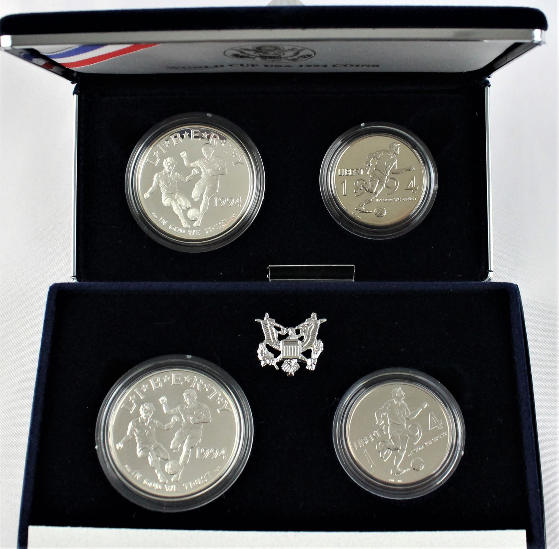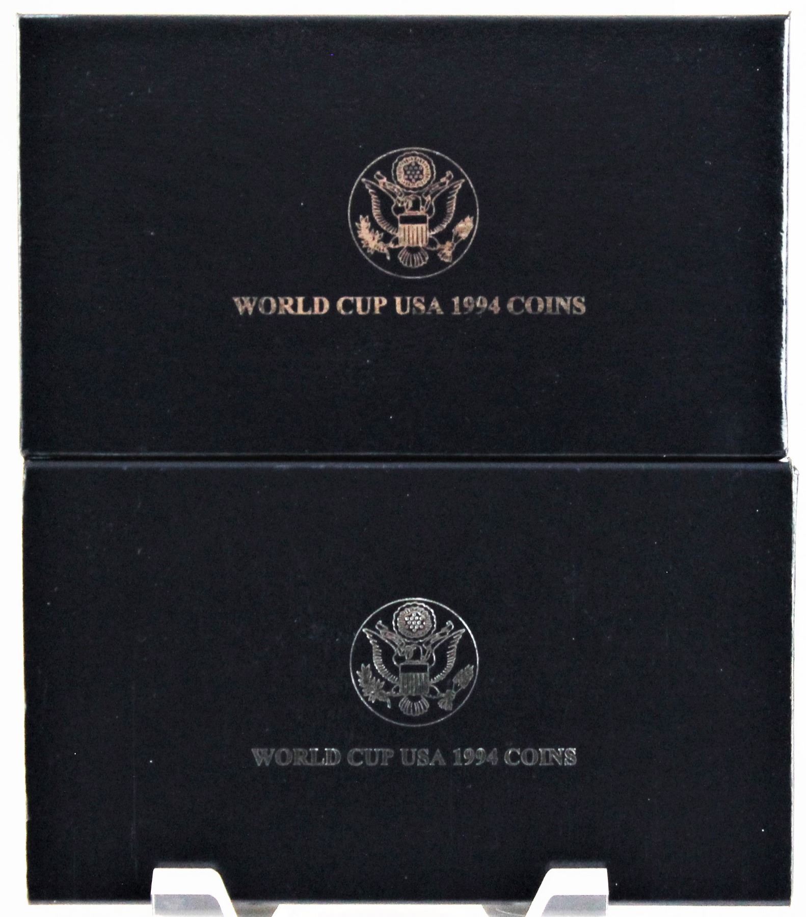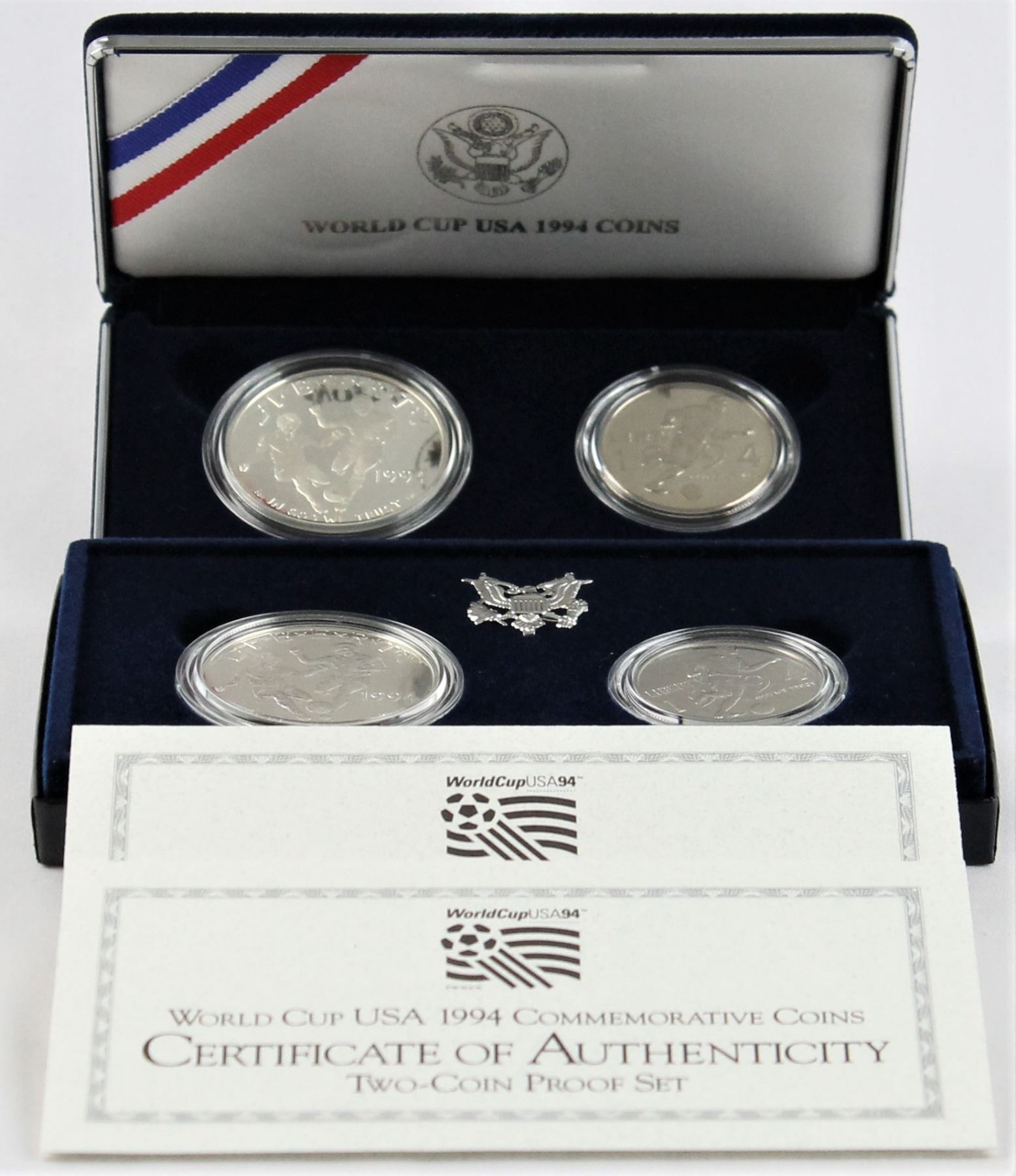 The U.S. Mint produced Proof Silver coins in 1994 to celebrate the first World Cup Soccer Championship played in the United States. This set contains the Silver dollar and clad half dollar coins displayed in a mint-issued case.