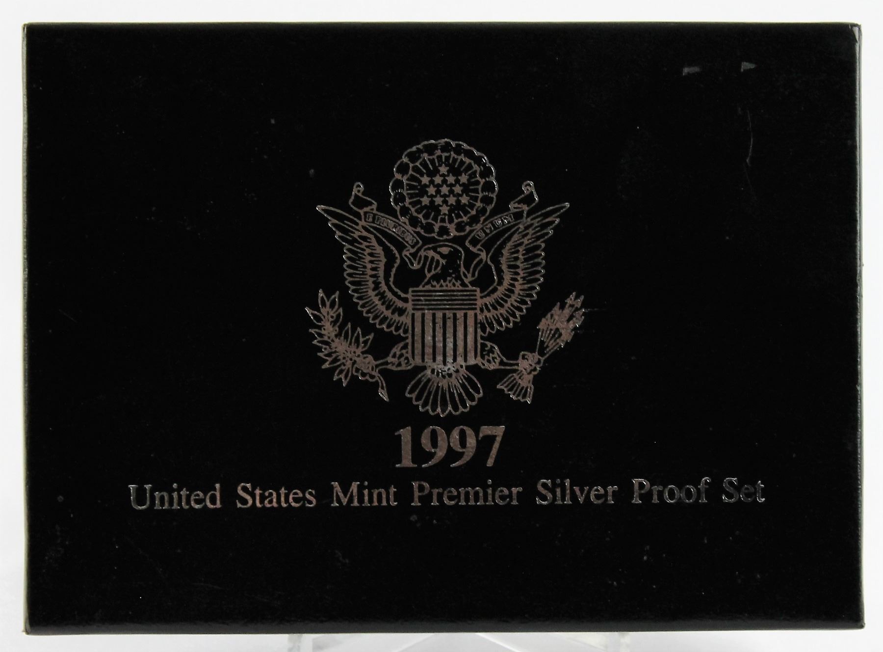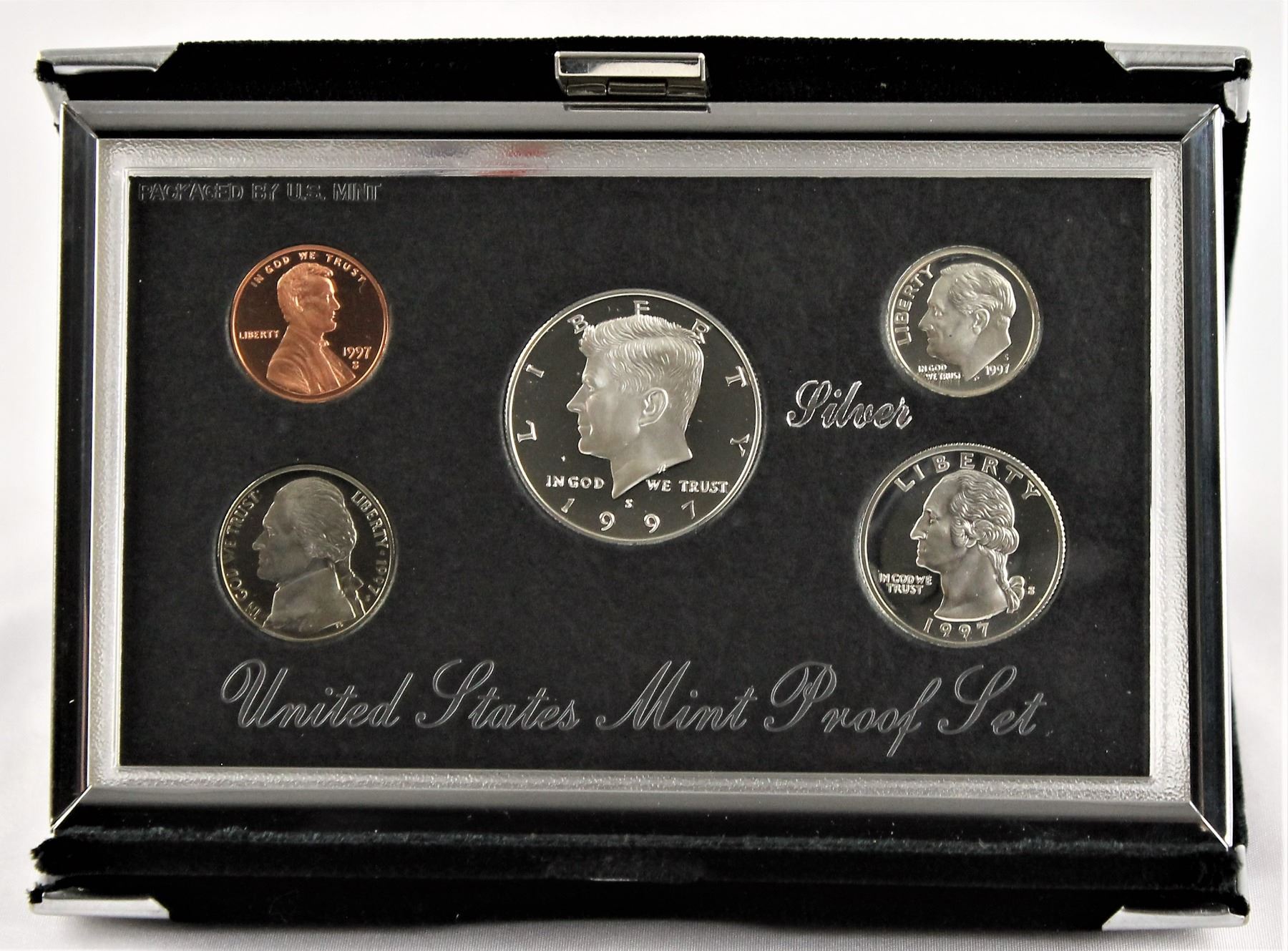 This 1997 Premier Silver Proof Set includes 5 coins in a display case including a Kennedy half dollar, a Washington quarter and a Roosevelt dime in 90% Silver.