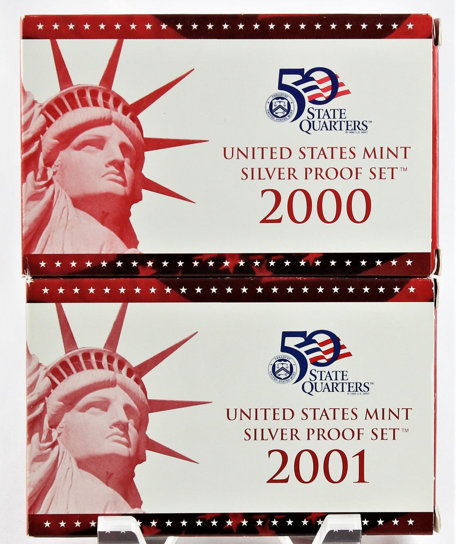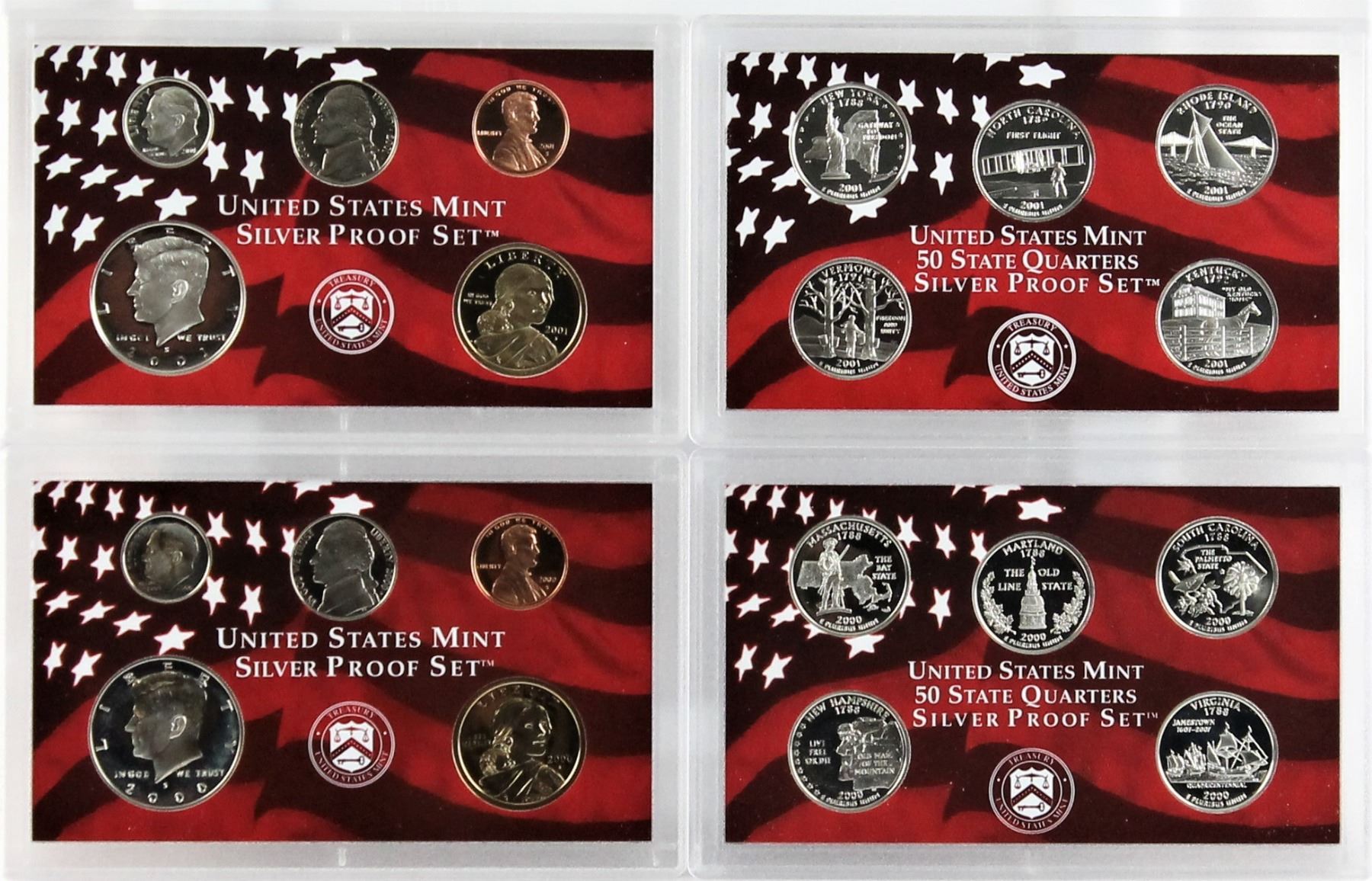 These 10-piece sets includes a dollar, half dollar, dime, nickel, and cent, as well as the 2001 releases of the popular Statehood Quarter Series, all in a beautiful proof finish. The half dollar, dime, and quarters are all minted in 90% Silver.