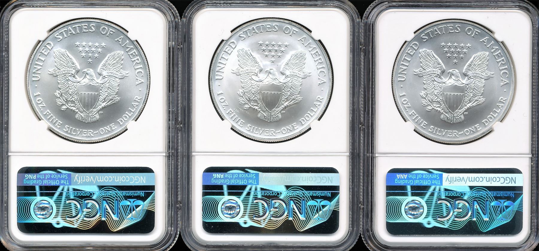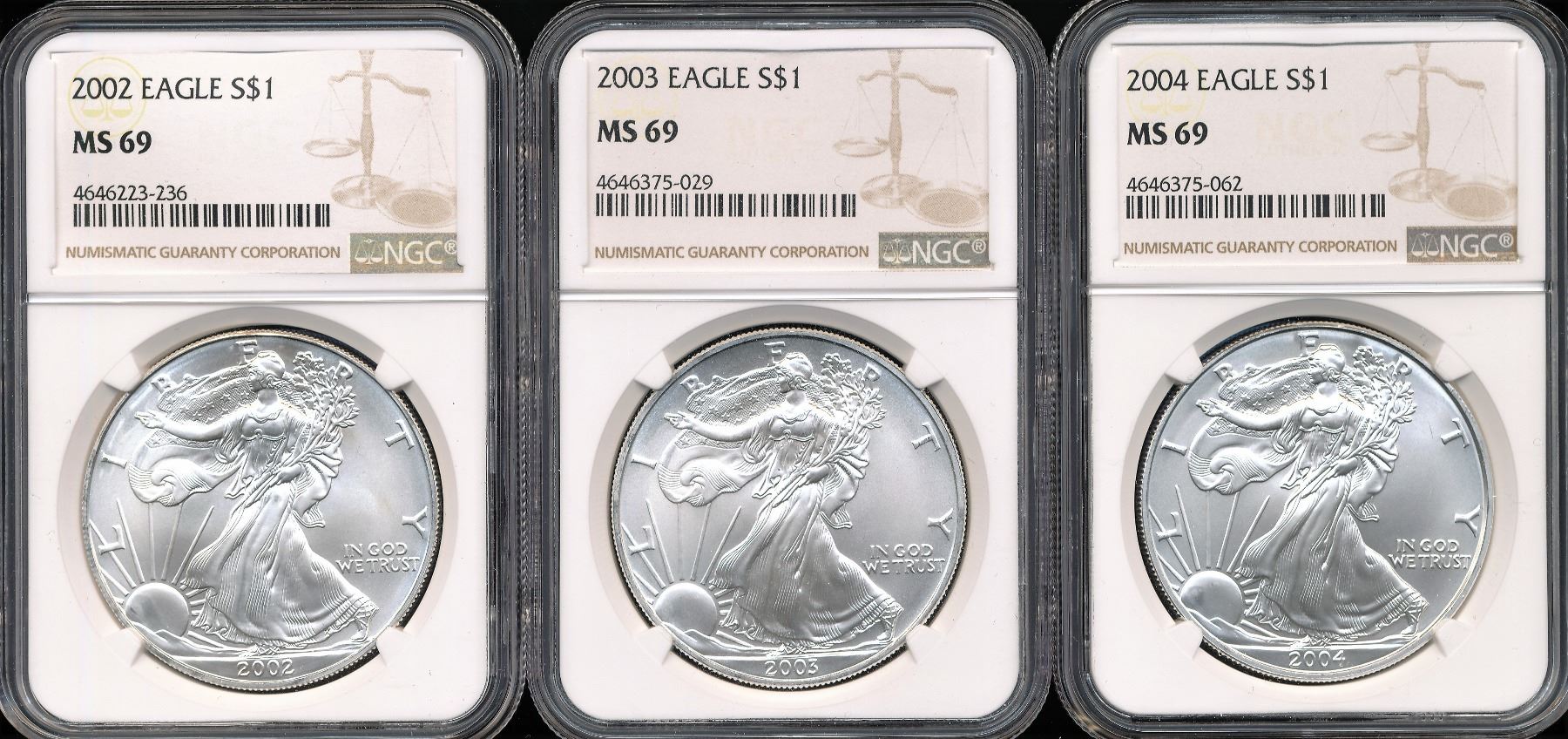 U.S. 2002, 2003 & 2004 $1 American Silver Eagle NGC MS69