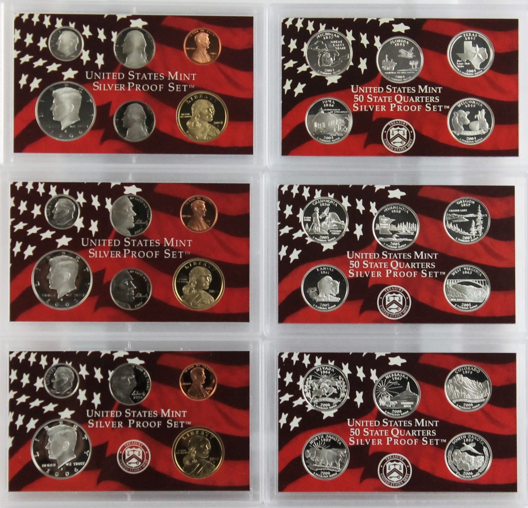 U.S. 2004, 2005 & 2006 Silver Proof Sets - These 9-piece sets includes a half dollar, dime, nickel, and cent, as well as the five releases of the popular Statehood Quarter Series, all in beautiful proof finish. The half dollar, dime and quarters are all minted in 90% Silver.