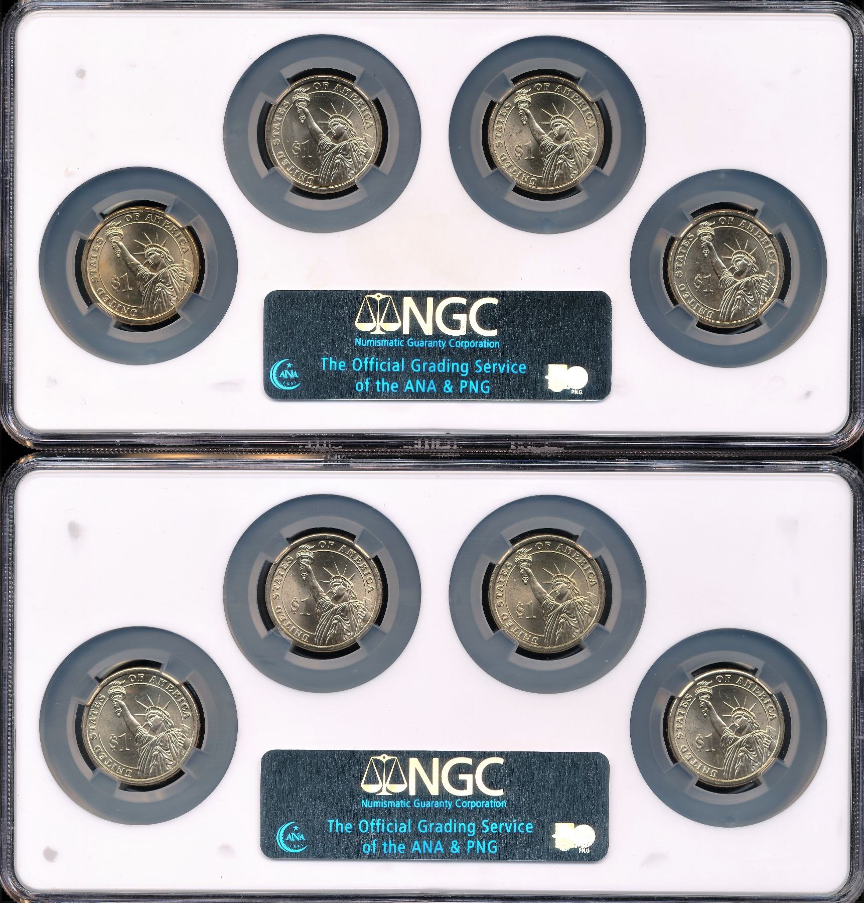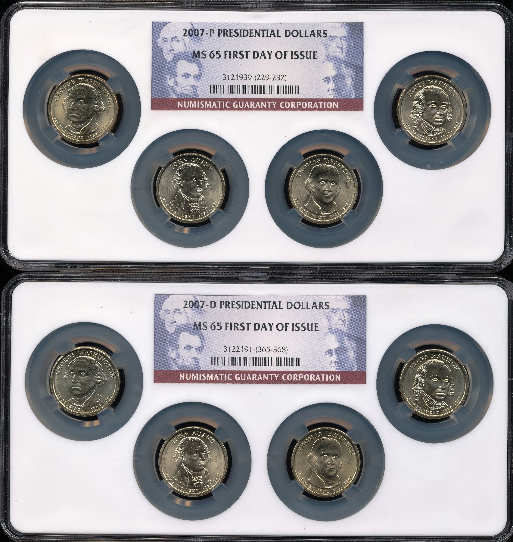 2007- P & D Presidential Dollars NGC MS65 First Day of Issue Slabs 8 Coins in total. Philadelphia and Denver minted issues.