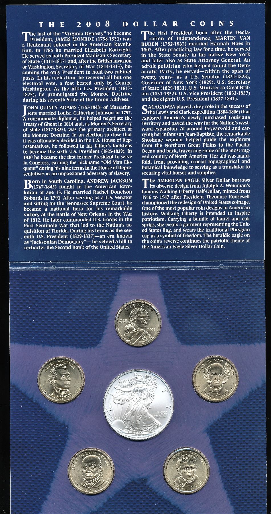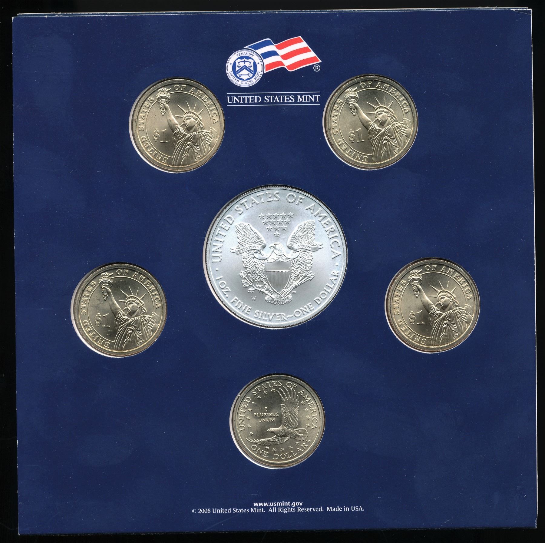 This set, produced by the U.S. Mint, features all 6 of the 2008 coins denominated as dollars: the Sacagawea dollar, four satin-finish Presidential Dollars, and a burnished 2008-W Silver Eagle.