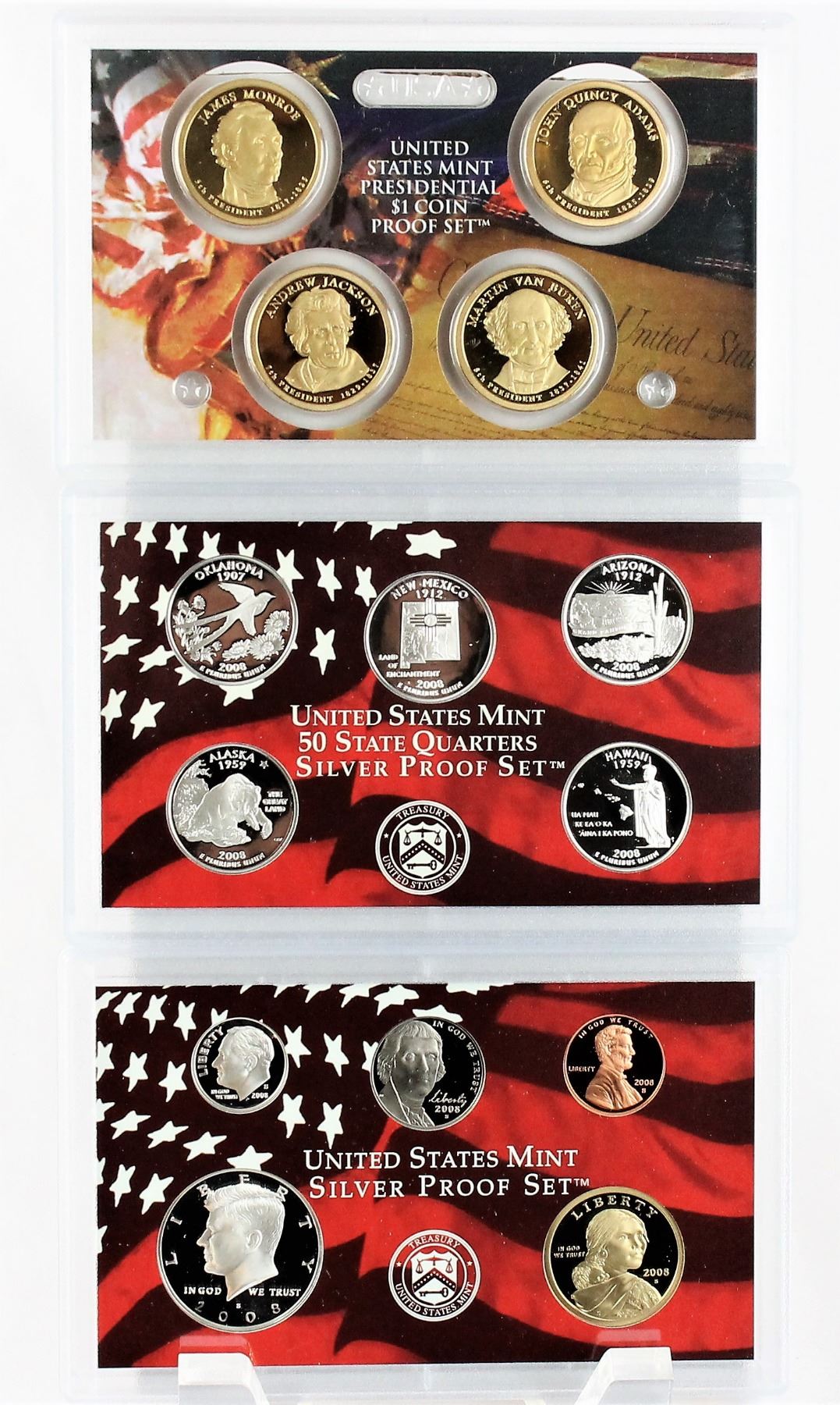 This 14-piece set includes a half dollar, dime, nickel, cent, the 2008 Statehood Quarters and 2008 Presidential Dollars - all in a beautiful proof finish! The half dollar, dime and quarters are minted in 90% Silver.