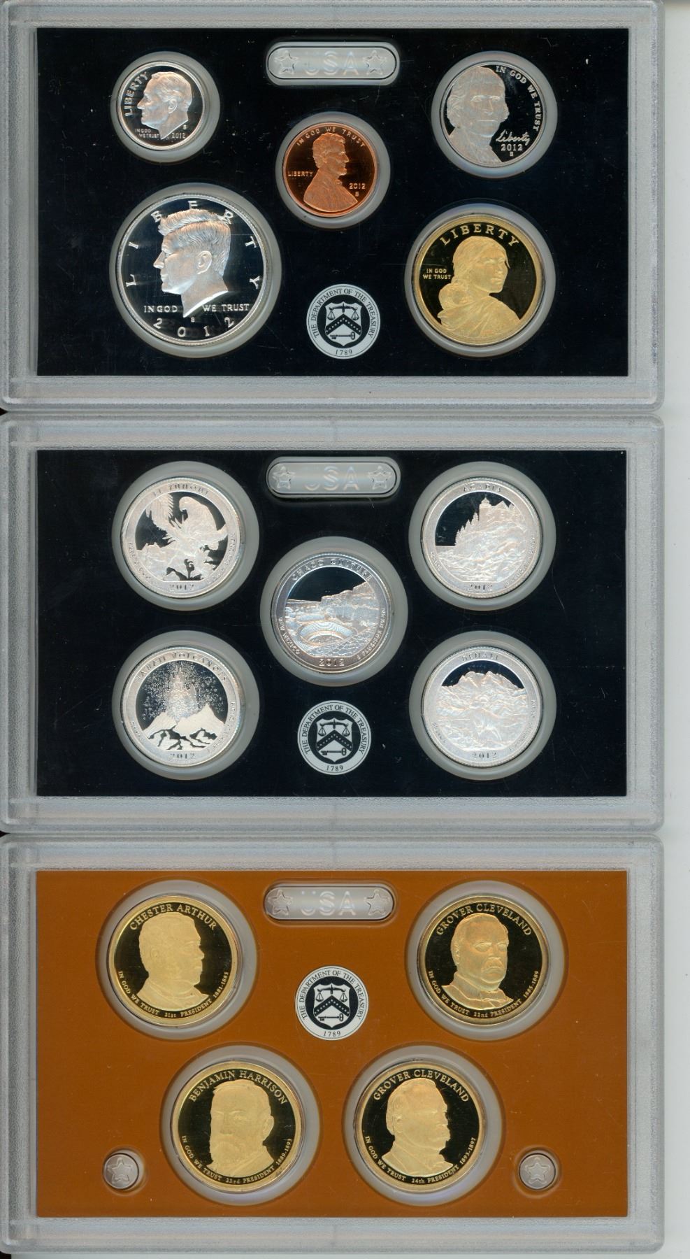 U.S 2012S Silver Proof Set. 14-coin Proof Set includes Silver Proof Set, Silver National Parks Proof Quarters (Puerto Rico, Maine, New Mexico, Hawaii & Alaska), and 4 Presidential Dollars (Arthur, Cleveland, Harrison & Cleveland). Housed in its original cases & box of issue.