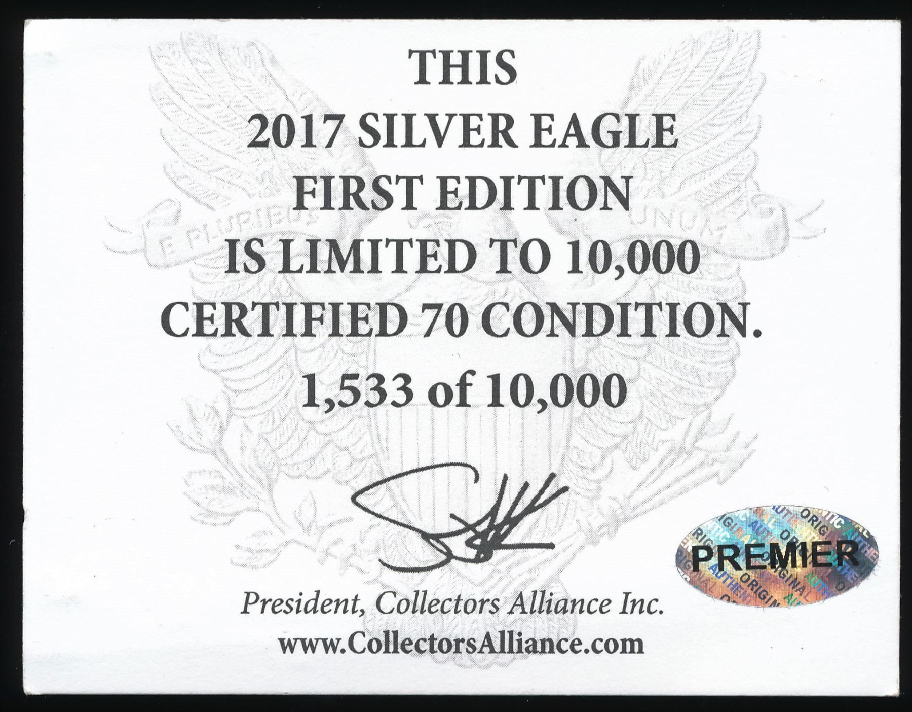 U.S. 2017 American Siver Eagle PCGS MS70 Premier First Edition 1 of 10,000 with COA!