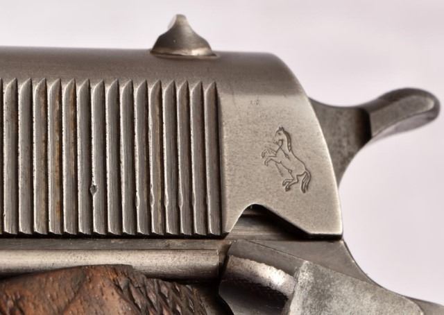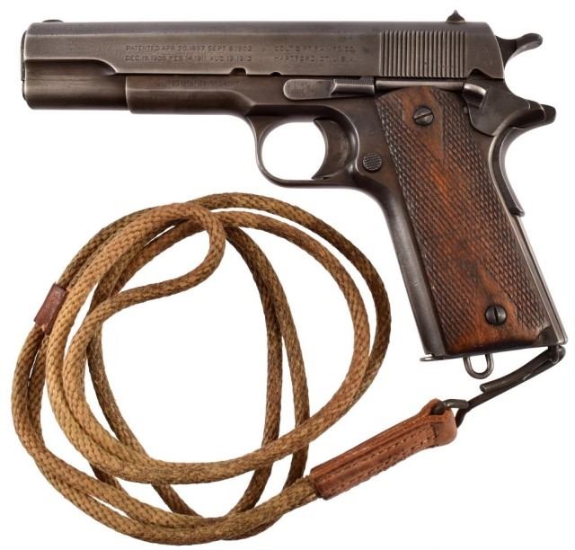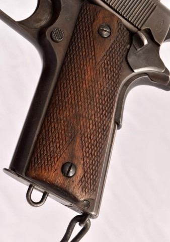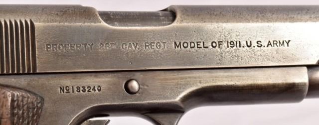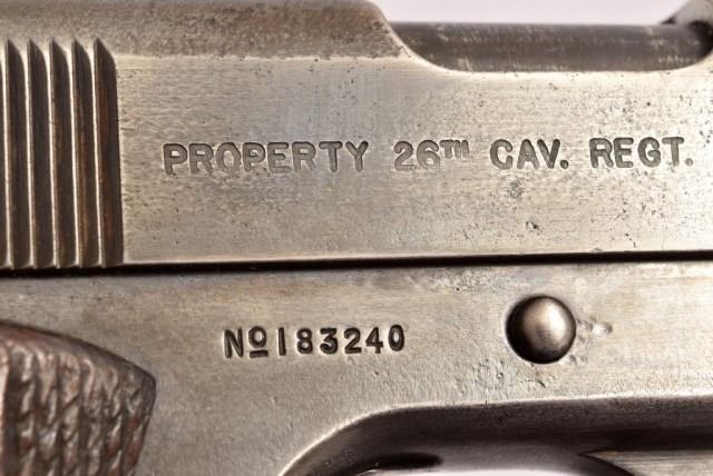 * Colt U.S. Army M-1911 .45 caliber semi-automatic pistol. Stamped serial "No.183240", "PROPERTY OF 26TH CAV. REGT. MODEL OF 1911. U.S. ARMY." On right side is scratched "Frank H. Bunnell 26th Cavalry." Attributed to 1st Lt. Frank Hinton Bunnell, 26th Cavalry Regiment (Philippine Scouts). The 26th Cavalry purchased them from U.S. Govt. around 1928 and is a rare example of Colt owned by the regiments. Lt. Edwin Ramsey of the 26th Cavalry led the last cavalry charge of the U.S. Army on January 16th 1942 carrying Model 1911s instead of sabers. After the successful charge, he managed to escape into the mountains & spend the next 3 years fighting the Japanese alongside the Filipino guerillas.