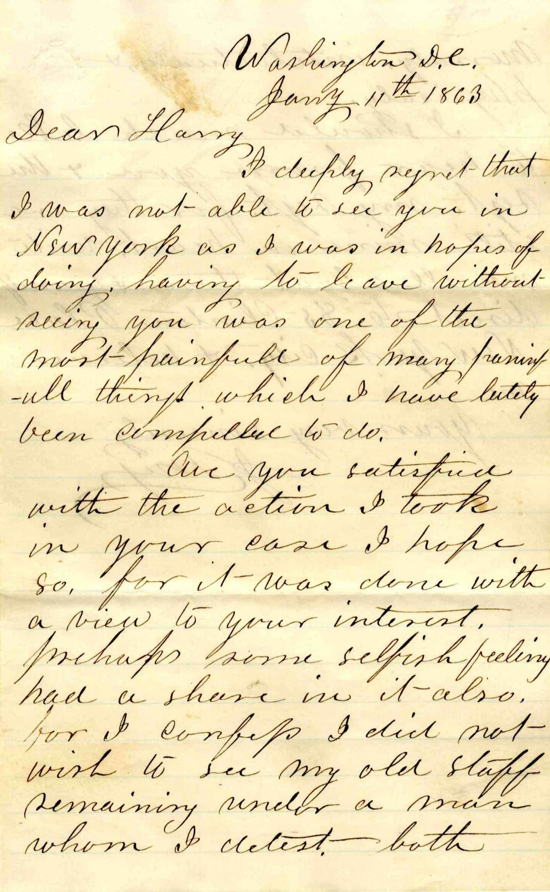 ALS from First Lieutenant John Mix of the 2nd U.S. Army Cavalry. Accompanied by cover. Datelined ''Washington D.C., Jany 11th 1863,'' Mix writes to his friend, the Quartermaster Sergeant of the 3rd New York Cavalry, in which regiment Mix had prior service. Excerpt: ''...I deeply regret that I was not able to see you in New York as I was in hopes of doing, having to leave without seeing you was one of the most painfull of many painfull things which I have lately been compelled to do. Are you satisfied with the action I took in your case, I hope so, for it was done with a view to your interest, perhaps some selfish feeling had a share in it also. For I confess I did not wish to see my old staff remaining under a man whom I detest, both morally, intelectualy & physically. I should much like to hear from you and the regt, my regt for they are still mine in heart. Write me all about them and yourself...'' Commissioned into the 3rd New York Cavalry on 21 September 1861, Mix resigned on 27 December 1862 and was re-commissioned into the 2nd U.S. Army Cavalry the same day. He was promoted to Captain of the 2nd U.S. Cavalry on 19 October 1865. Letter measures 5'' x 8'' and runs 2pp. Separation at center fold and scattered light soiling. Excellent condition.