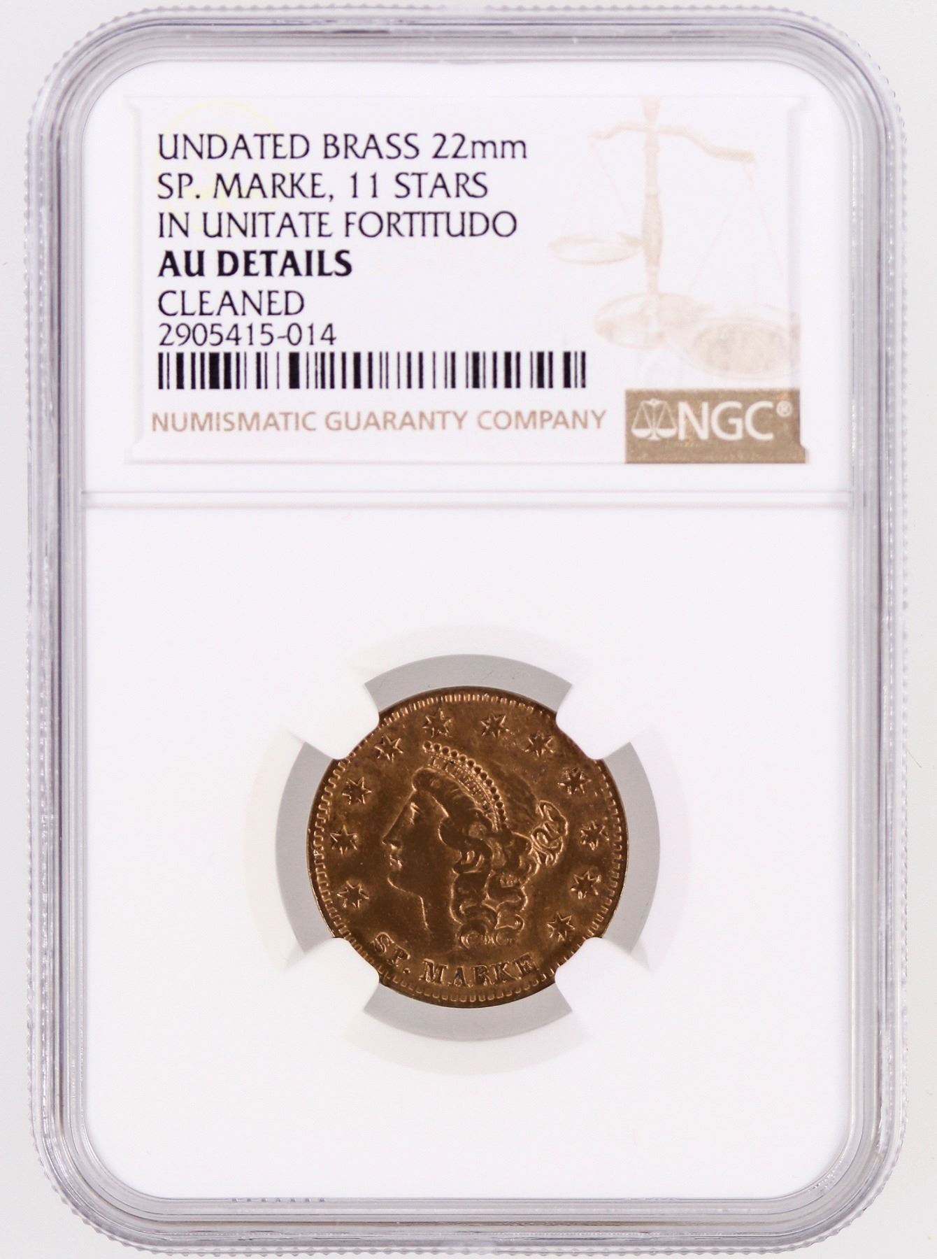 NGC certified AU Details, cleaned. Undated brass, 22 mm, spiel marke, 11 stars, in the fashion of a U. S. $5 gold piece. "In Unitate Fortitudo" on the reverse.