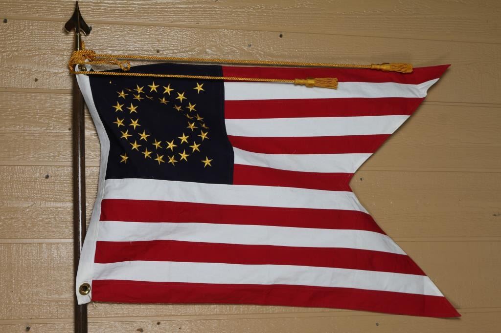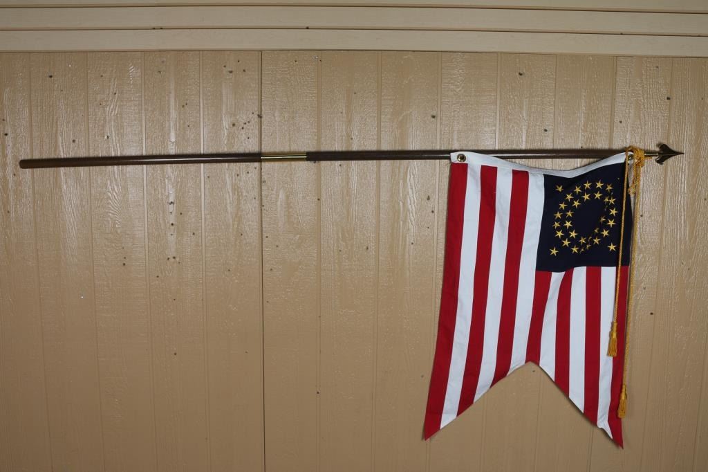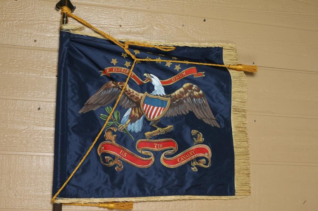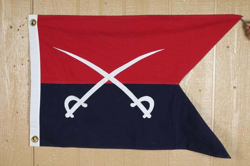High Quality set of the U.S. swallowtail flag with 34 circular stars, gold colored tassels,42 x 24, and the flag of the U.S. 7th Cavalry, blue with the American Eagle, gold colored fringe, 25 x 27. Mounted on mahogany poles with brass fittings. Poles screw in half with the upper half measuring 54 1/2". Also included is a 7th Cavalry Guidon, red and white with ":7", & "A". very well made. Custer's swallowtail cavalry guidon, red & blue with white crossed sabers. All in very good condition. From the Joe Musso Collection. Due to the length, buyer must make arrangements of shipping.