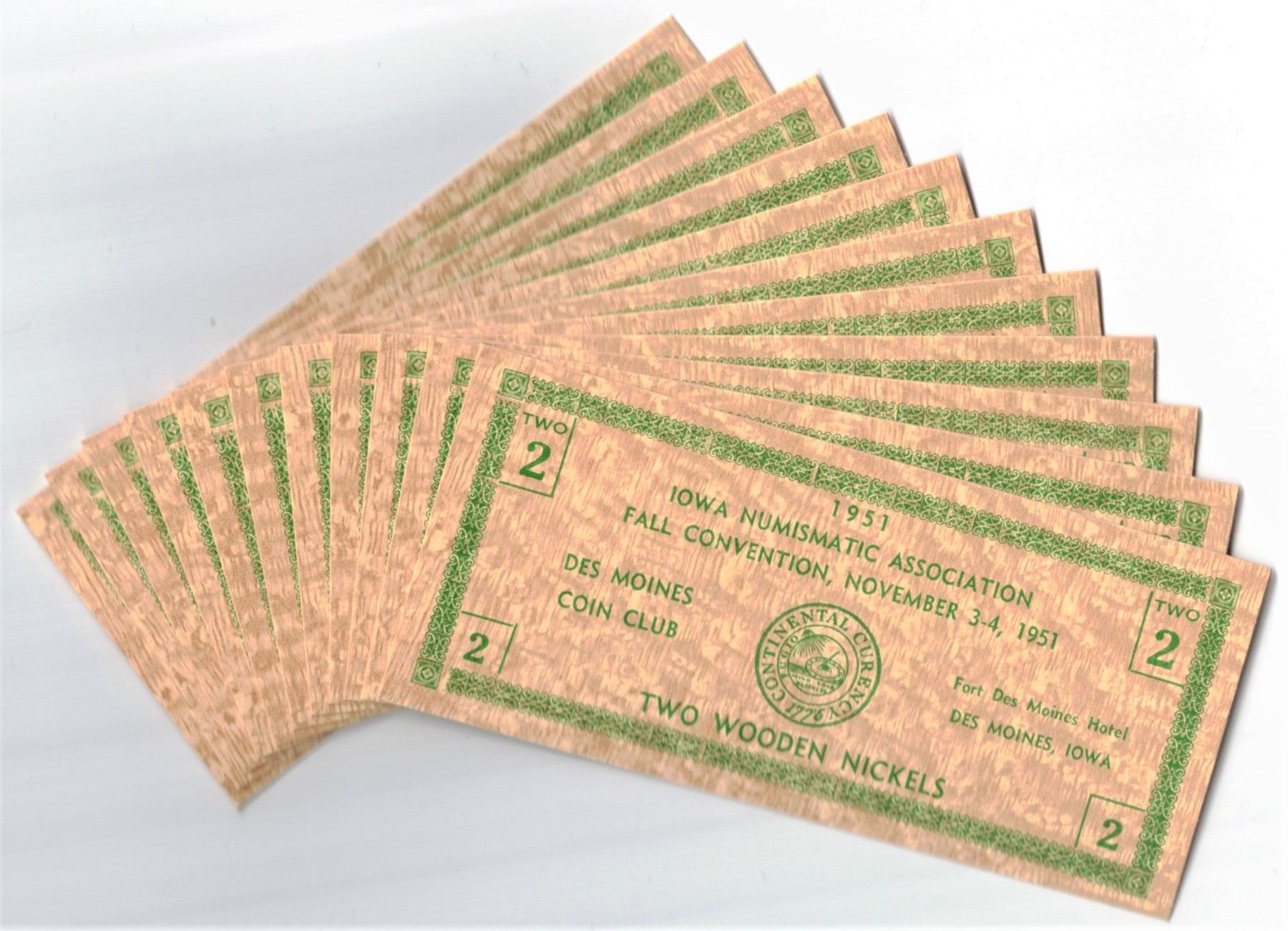 U.S.A. 0.10c Iowa 1951 (two wooden Nickels {10c} notes) x 11 notes Iowa Numismatic Association Fall Convention all in UNC, Interesting Memorabilia to be checked (11)