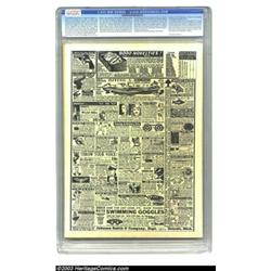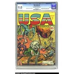 U.S.A. Comics #1 Larson pedigree (Timely, 1941) CGC VF/NM 9.0 Off-white to white pages. If we had to pick an early Timely #1 issue that seems undervalued, this might be the one. The wartime run, from 1941-1945, featured some great patriotic superheroes, including Captain America himself, after issue #5. Classic Joe Simon and Jack Kirby art adorns the cover, as Nazis are depicted in the vilest way. Origins abound in the issue; for instance, Major Liberty, Rockman by Wolverton, and the Whizzer by Avison. The Defender with sidekick Rusty, Jack Frost, and the Young Avenger also weigh in. To date, this pedigree copy ties for the honor of having the highest CGC-assigned grade for issue #1. Breathtaking cover colors make this as pretty a book as it is historically significant. CGC notes, "Very minor amount of glue on spine of cover." Overstreet 2003 VF/NM 9.0 value = $12,375; NM 9.4 value = $16,500. Important notice: Heritage usually auctions material at the rate of 200-250 lots per hour. On some occasions eBay Live bid software or the Internet may not be able to keep up with the pace of the auction. We recommend placing a realistic absentee bid now as insurance to avoid disappointment. Occasionally the auctioneer may eliminate or reject an eBay Live bid, and the auctioneer may also reopen a lot after the close of the eBay live bidding (usually because we missed an audience bid), and may reject your bid even if it shows you as the winning bidder. By bidding via eBay Live, you agree that Heritage may award the lot to another bidder at its sole discretion under the circumstances described above or any other reasonable circumstances. Also please note that all Heritage lots purchased through eBay Live carry a 20% Buyer's Premium. Please make sure you read the Terms and Conditions before you bid.