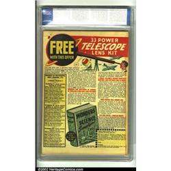 U.S.A Comics #8 (Timely, 1943) CGC VG+ 4.5 Slightly brittle pages. How surprising! Captain America has to come to Bucky's rescue. Alex Schomburg and Al Gabriele created another wartime masterpiece, showing Bucky in bondage again. This book displays very well, and has the visual appeal of a Very Fine. Overstreet 2002 GD 2.0 value = $191; FN 6.0 value = $573. Important notice: We expect to be auctioning lots at the rate of 200-250 per hour. Sometimes eBay Premier live bid software cannot keep up with that pace, so we strongly recommend that you place a realistic proxy bid now as insurance to avoid disappointment. Also please note that all Heritage/CAA lots purchased through eBay Premier carry a 20% Buyer's Premium.