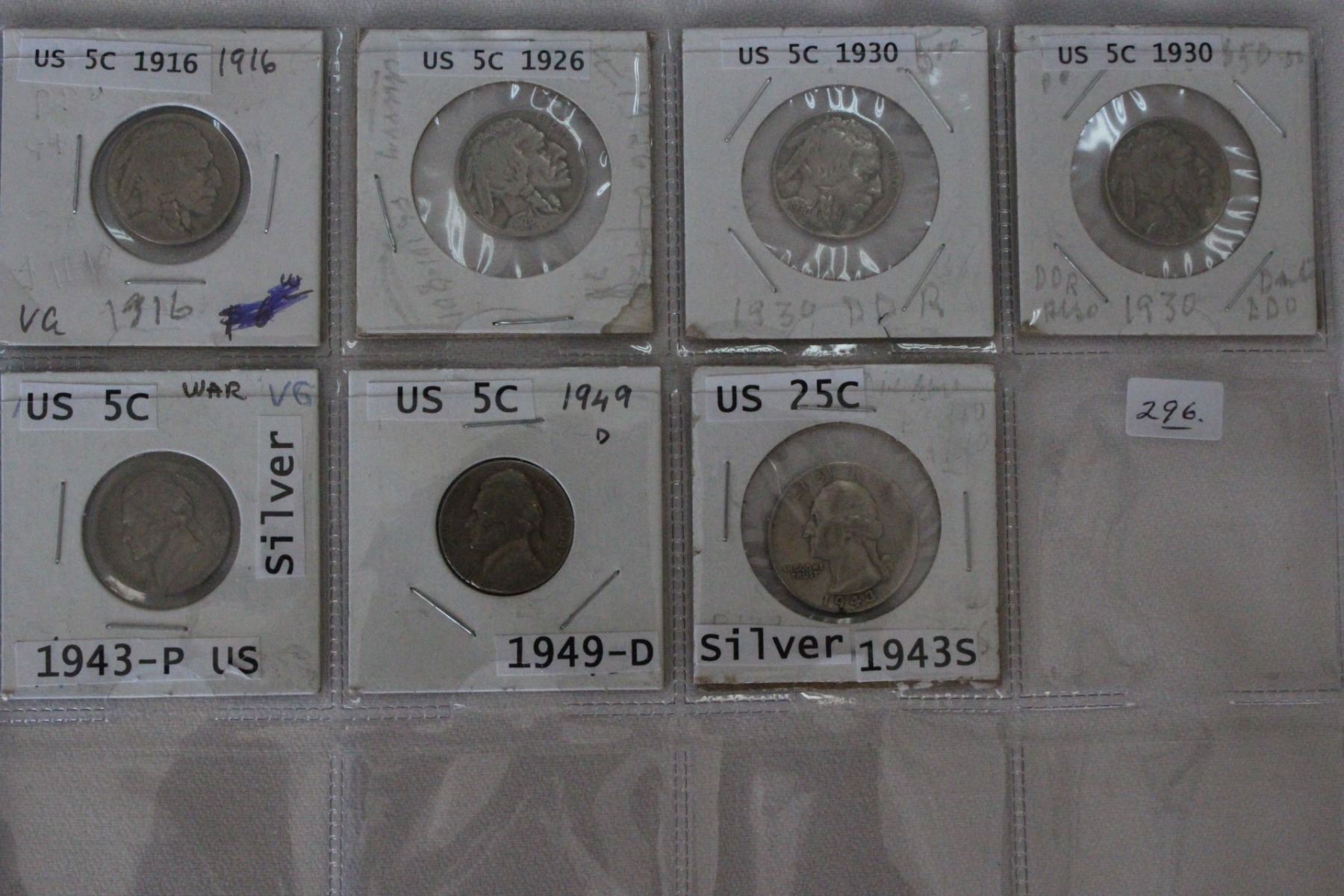 Fives: 1916, 1926, (2)1930; 1943P (Silver) 1949-D; 25¢: 1943S (Silver)