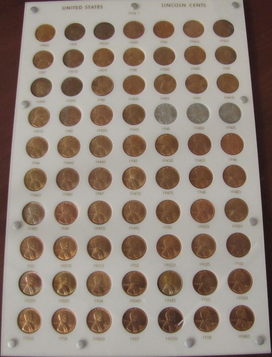 U.S.A. Lincoln 1¢ Set Complete. 1934D-1958D 1¢, 70 coins in all. HoU.S.A.ed in a Capital Holder, all coins are UNC 60 +++. Should be viewed.